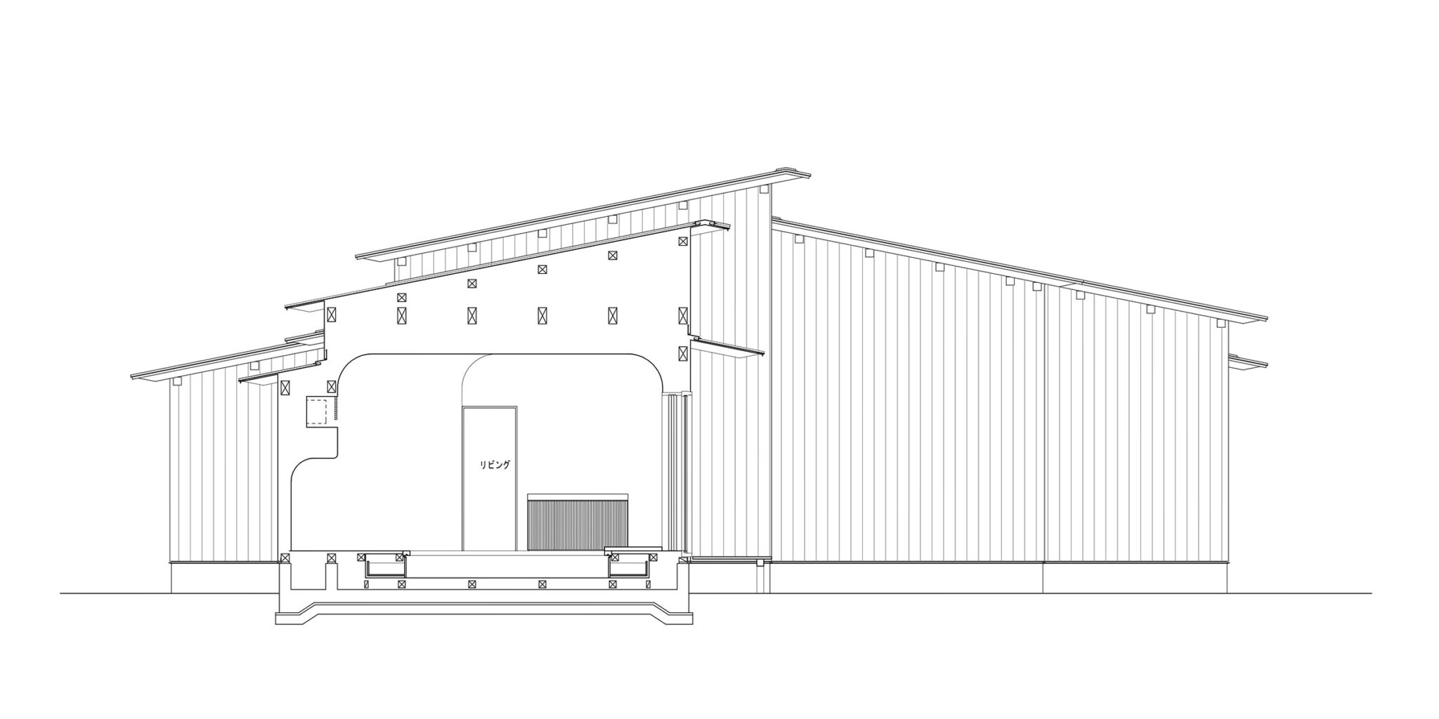 藤田時彦 / atelier umiによる、滋賀・高島市の「安曇川の家」。豊かな自然に囲まれた大きな敷地。施主の“森の中に住みたい”という要望を起点とし、“森のような要素”を空間に導入する計画を志向。天井高の変化と“柔らかなアール”の連続で木々の下を歩く様な感覚を生み出す断面図 image©atelier umi