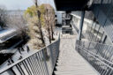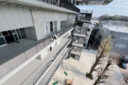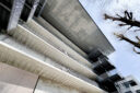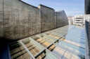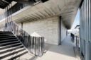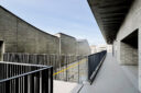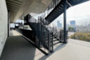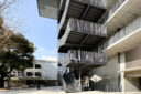 内藤廣建築設計事務所による、東京・世田谷区の「多摩美術大学 上野毛キャンパス新棟」。講義室・ギャラリー・講堂などを内包する施設。“雨露を凌ぐ清朗な覆い”となる大屋根があり、“競い合い、絆を結ぶ”ための交流テラスを備えた建築を考案。講堂は目に止まるように“お椀を伏せた”様な形態とする4階から5階への屋外階段 photo©architecturephoto