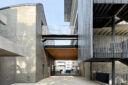 内藤廣建築設計事務所による、東京・世田谷区の「多摩美術大学 上野毛キャンパス新棟」。講義室・ギャラリー・講堂などを内包する施設。“雨露を凌ぐ清朗な覆い”となる大屋根があり、“競い合い、絆を結ぶ”ための交流テラスを備えた建築を考案。講堂は目に止まるように“お椀を伏せた”様な形態とする外観、中庭から本部棟の屋外階段を見る。 photo©architecturephoto