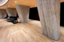 この屋根の下、学生たちが集い、演劇や音楽などの催しができる空間です。ギャラリーが開放的なのとは対照的に、こちらは、守られ、包み込まれるような空間になっています。