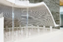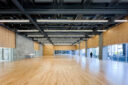内藤廣建築設計事務所による、東京・世田谷区の「多摩美術大学 上野毛キャンパス新棟」。講義室・ギャラリー・講堂などを内包する施設。“雨露を凌ぐ清朗な覆い”となる大屋根があり、“競い合い、絆を結ぶ”ための交流テラスを備えた建築を考案。講堂は目に止まるように“お椀を伏せた”様な形態とする1階、ギャラリー photo©architecturephoto