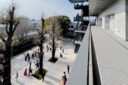内藤廣建築設計事務所による、東京・世田谷区の「多摩美術大学 上野毛キャンパス新棟」。講義室・ギャラリー・講堂などを内包する施設。“雨露を凌ぐ清朗な覆い”となる大屋根があり、“競い合い、絆を結ぶ”ための交流テラスを備えた建築を考案。講堂は目に止まるように“お椀を伏せた”様な形態とする1階、左:本部棟、正面:ガレリア、右:行動 photo©architecturephoto