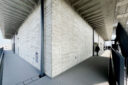 内藤廣建築設計事務所による、東京・世田谷区の「多摩美術大学 上野毛キャンパス新棟」。講義室・ギャラリー・講堂などを内包する施設。“雨露を凌ぐ清朗な覆い”となる大屋根があり、“競い合い、絆を結ぶ”ための交流テラスを備えた建築を考案。講堂は目に止まるように“お椀を伏せた”様な形態とする3階、総合デザイン学科、廊下 photo©architecturephoto