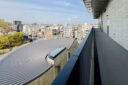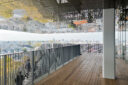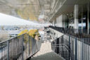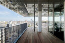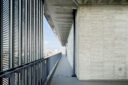 内藤廣建築設計事務所による、東京・世田谷区の「多摩美術大学 上野毛キャンパス新棟」。講義室・ギャラリー・講堂などを内包する施設。“雨露を凌ぐ清朗な覆い”となる大屋根があり、“競い合い、絆を結ぶ”ための交流テラスを備えた建築を考案。講堂は目に止まるように“お椀を伏せた”様な形態とする4階、バルコニー photo©architecturephoto