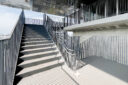 内藤廣建築設計事務所による、東京・世田谷区の「多摩美術大学 上野毛キャンパス新棟」。講義室・ギャラリー・講堂などを内包する施設。“雨露を凌ぐ清朗な覆い”となる大屋根があり、“競い合い、絆を結ぶ”ための交流テラスを備えた建築を考案。講堂は目に止まるように“お椀を伏せた”様な形態とする2階から3階への屋外階段 photo©architecturephoto