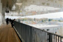 講義室・ギャラリー・講堂などを内包する施設の計画です。建築家は、“雨露を凌ぐ清朗な覆い”となる大屋根があり、“競い合い、絆を結ぶ”ための交流テラスを備えた建築を考案しました。また、講堂は目に止まるように“お椀を伏せた”様な形態としています。