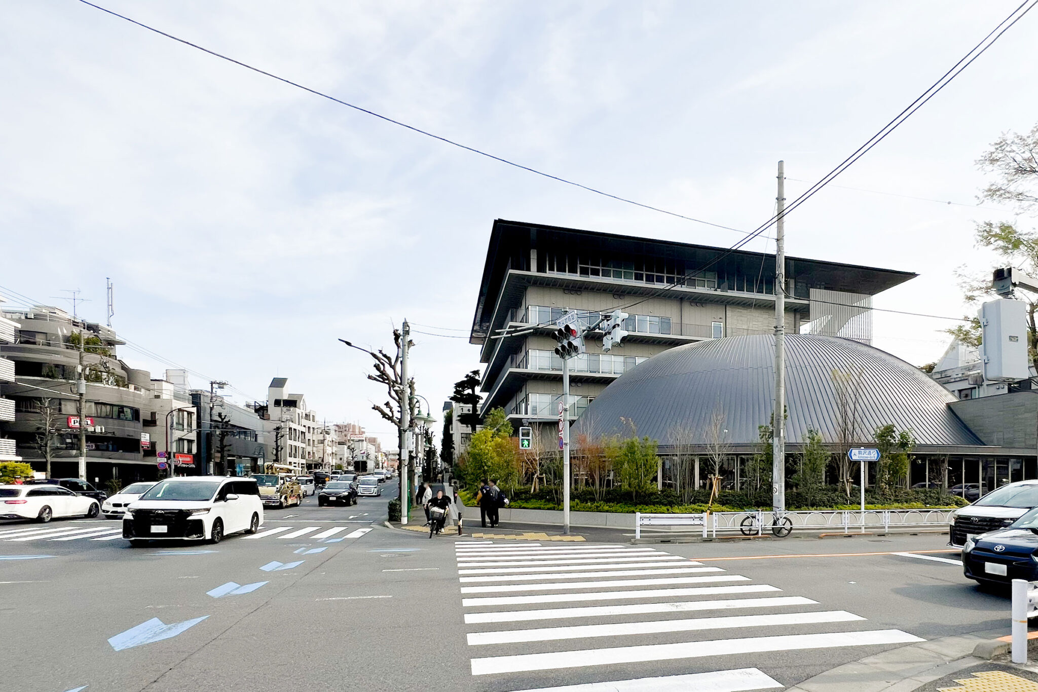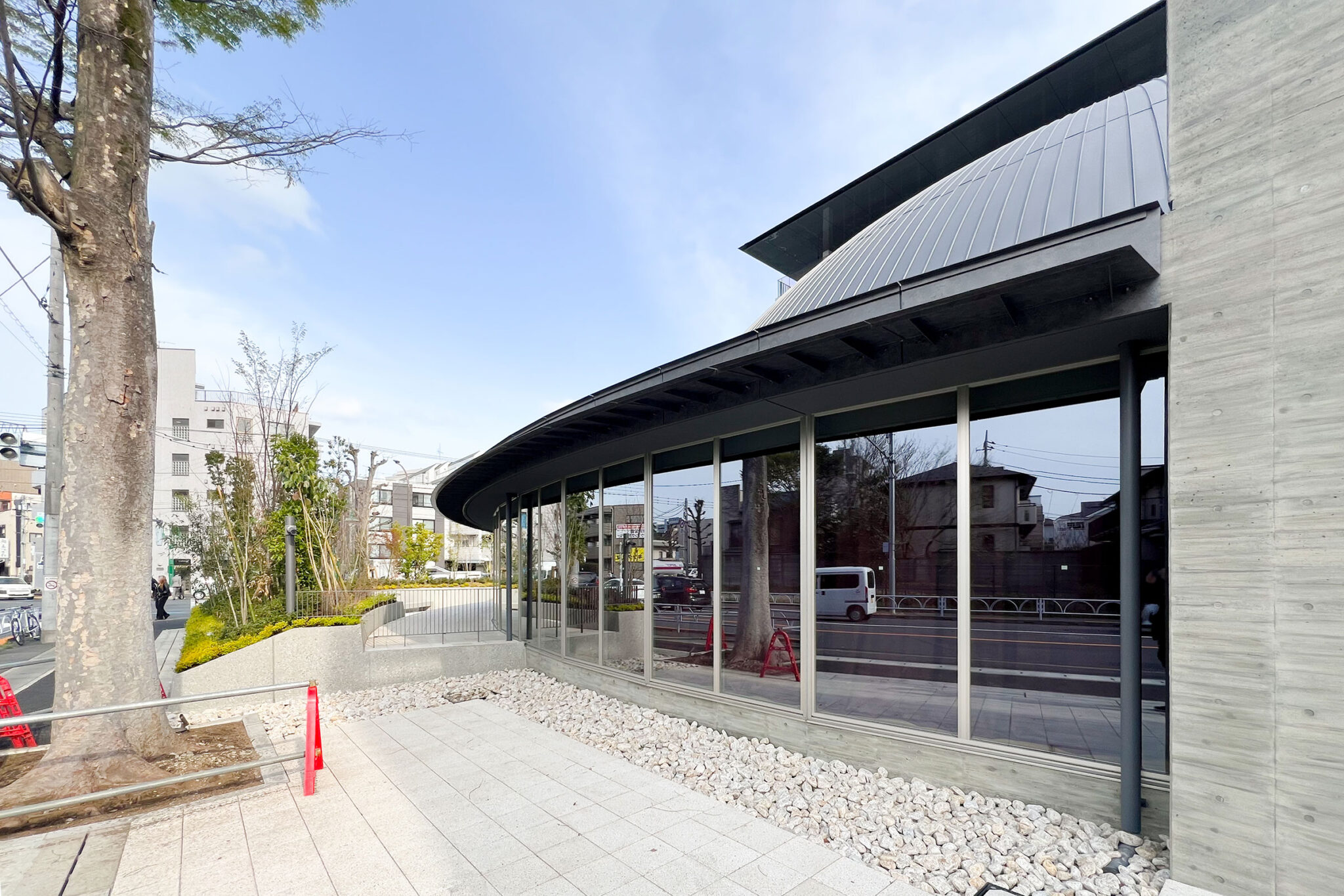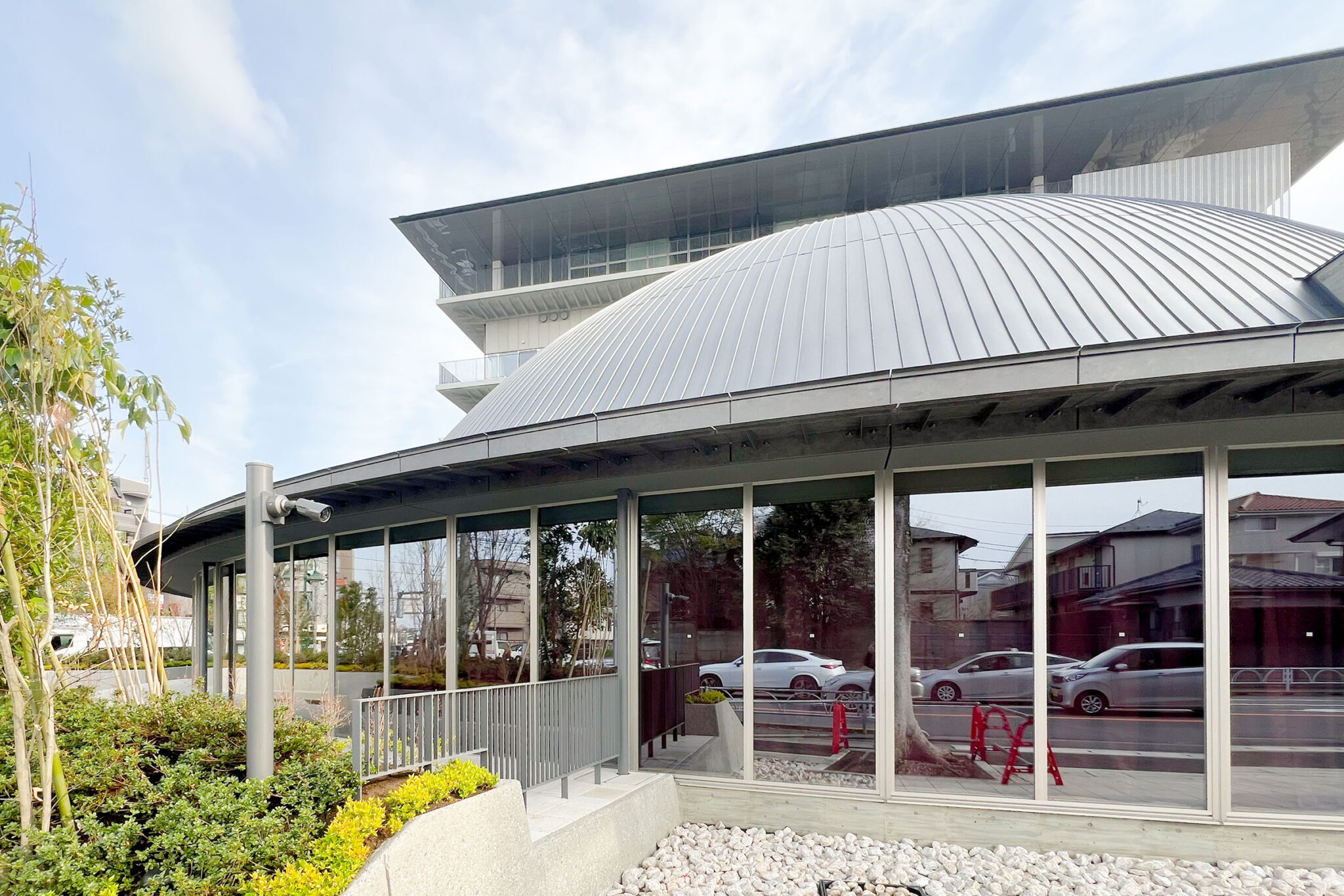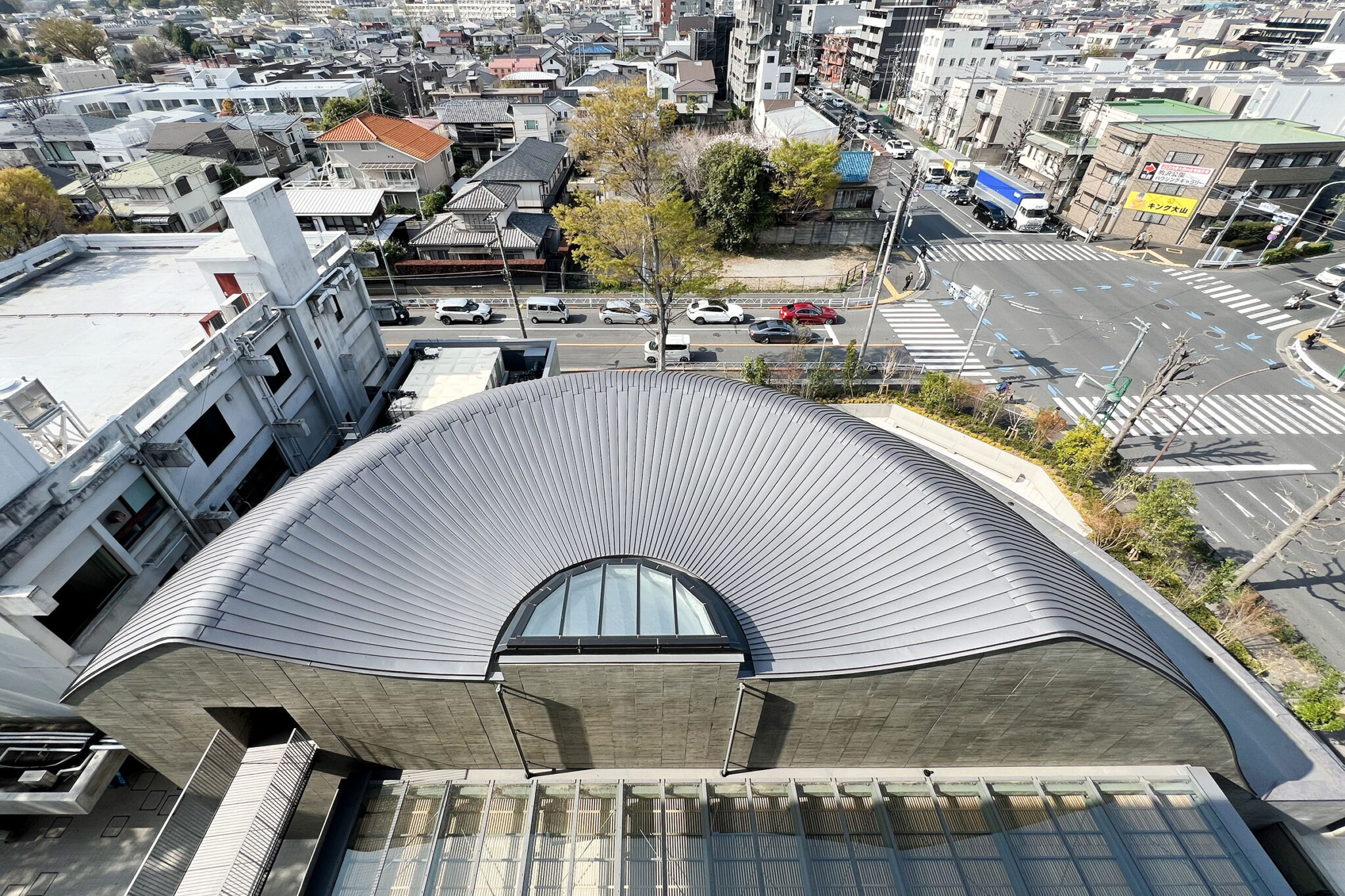内藤廣建築設計事務所による、東京・世田谷区の「多摩美術大学 上野毛キャンパス新棟」。講義室・ギャラリー・講堂などを内包する施設。“雨露を凌ぐ清朗な覆い”となる大屋根があり、“競い合い、絆を結ぶ”ための交流テラスを備えた建築を考案。講堂は目に止まるように“お椀を伏せた”様な形態とする外観、北側の交差点から見る。 photo©architecturephoto