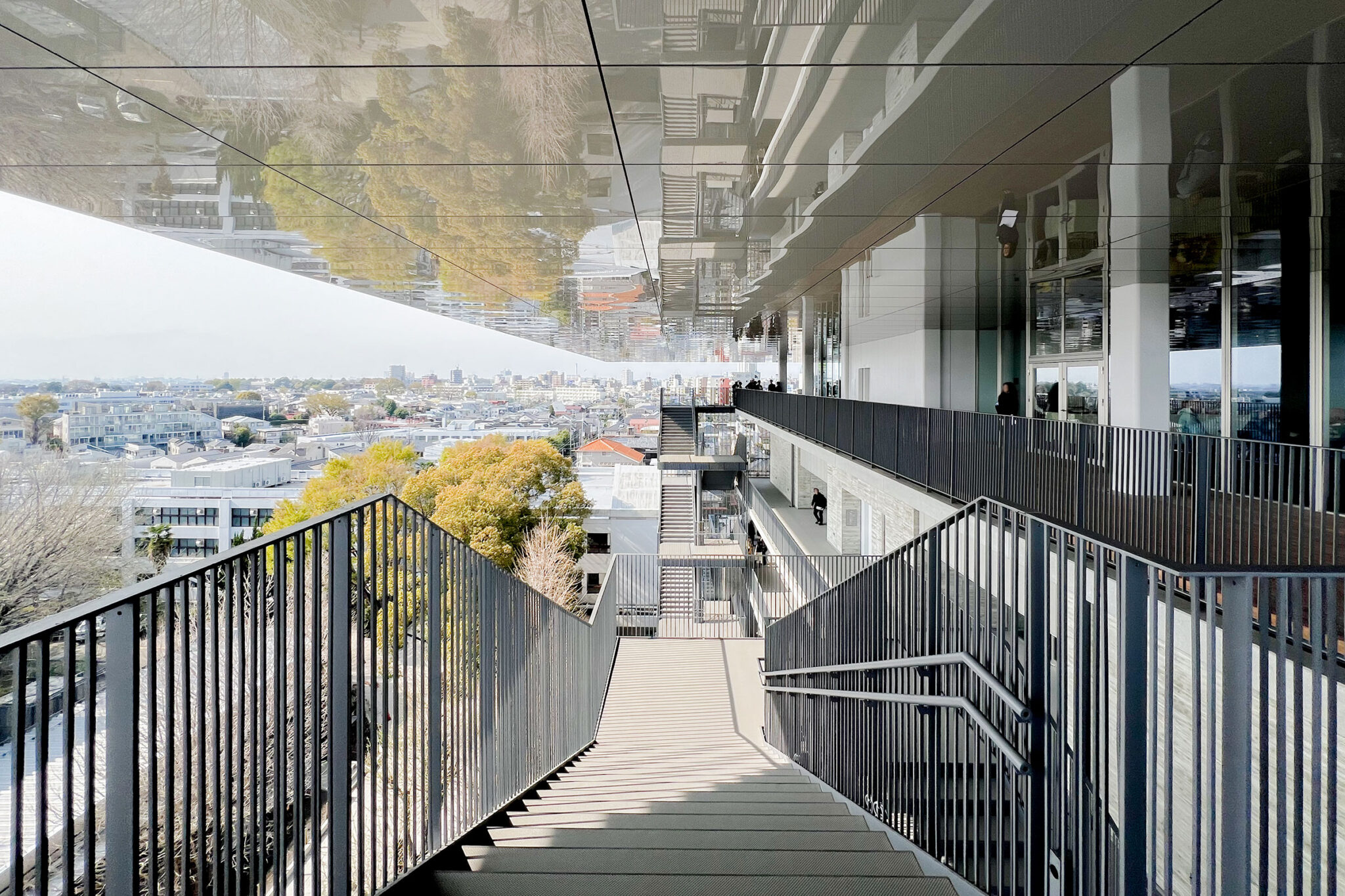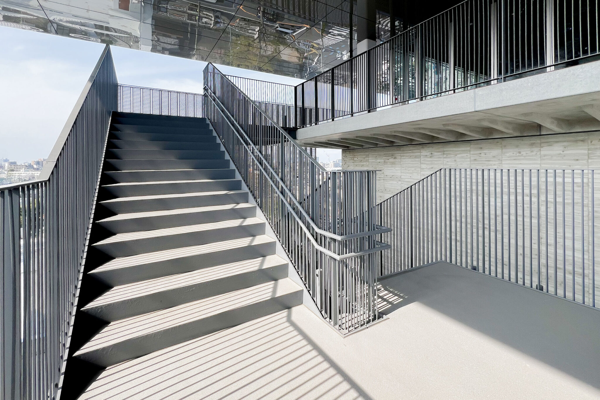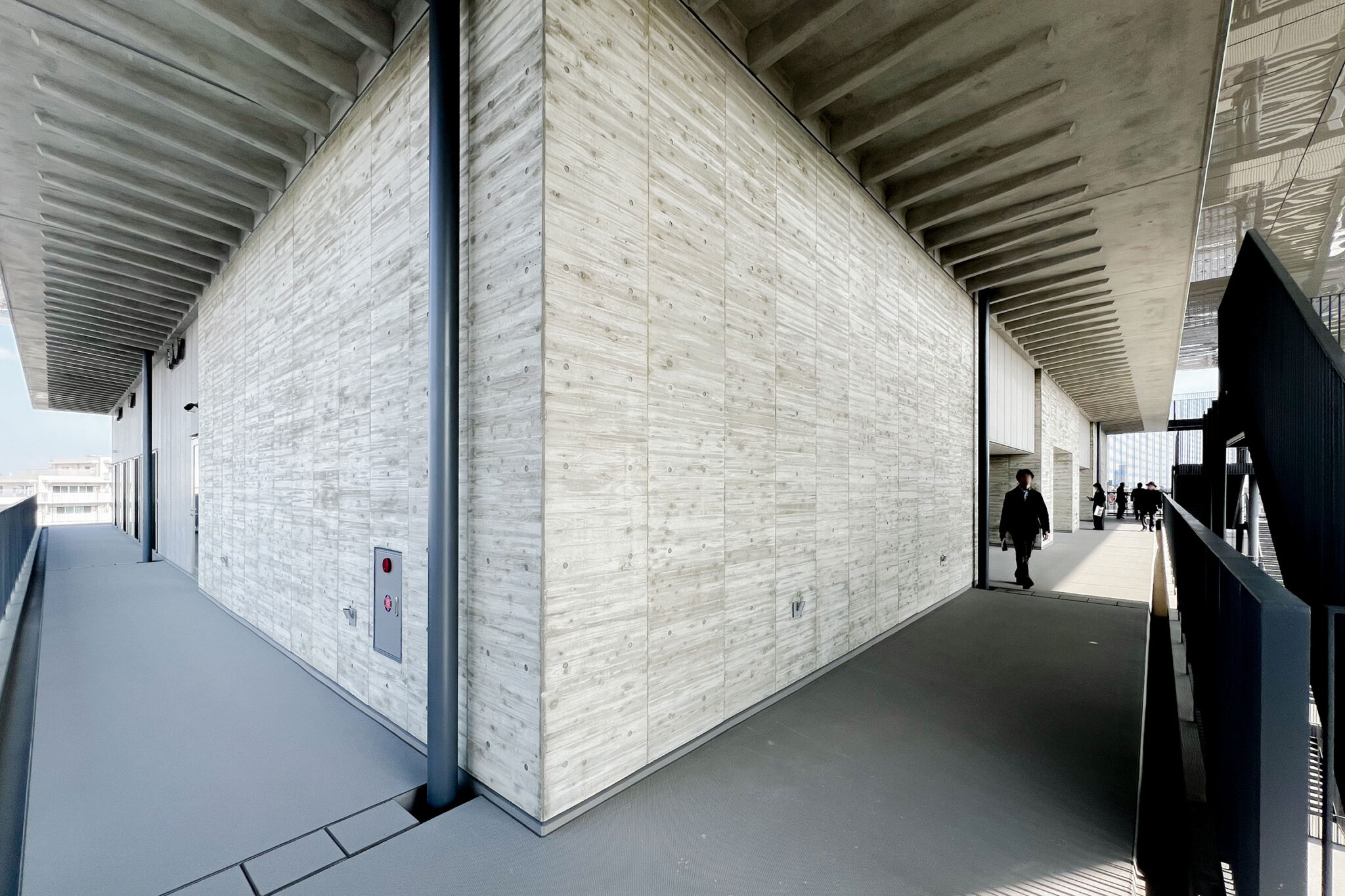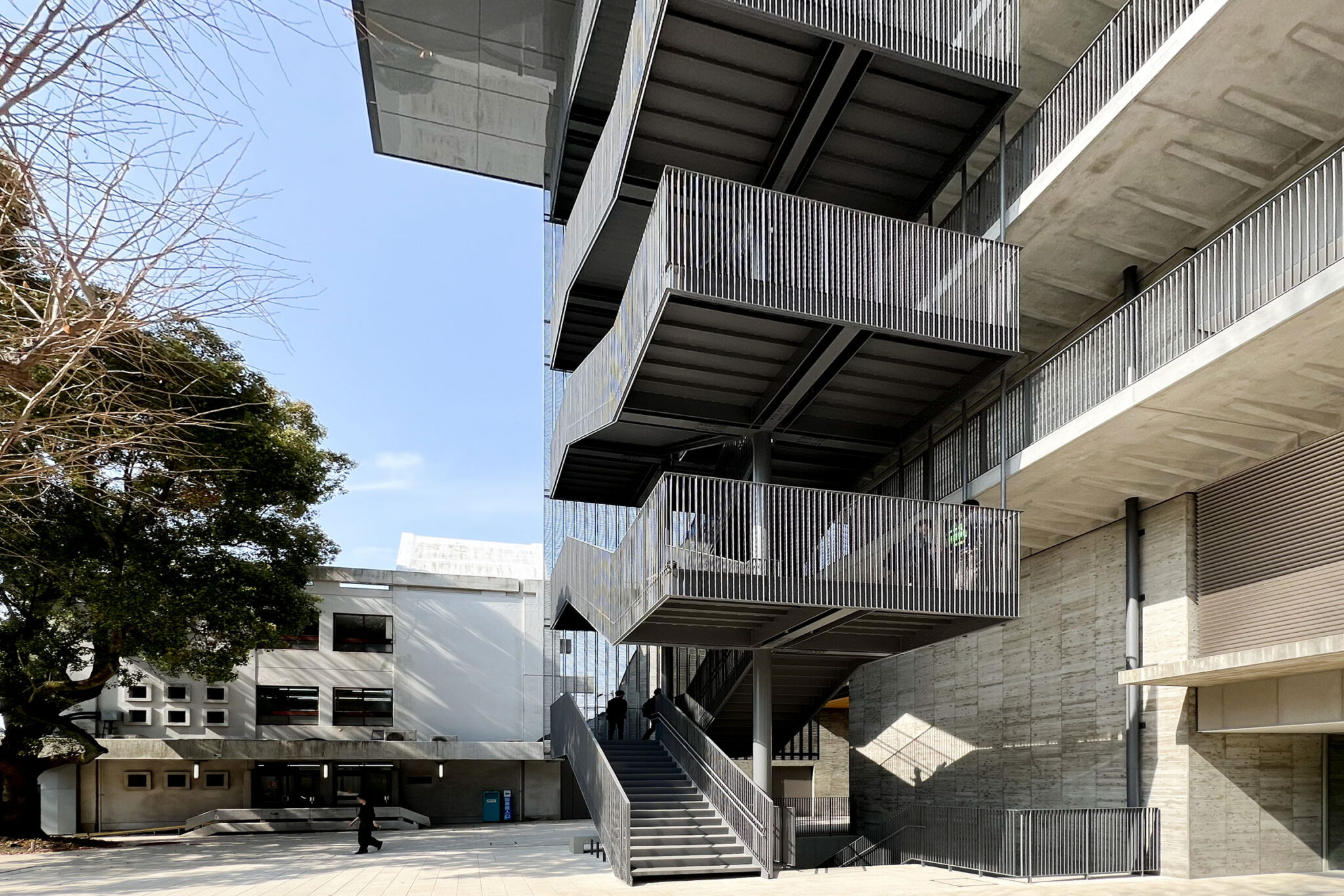 内藤廣建築設計事務所による、東京・世田谷区の「多摩美術大学 上野毛キャンパス新棟」。講義室・ギャラリー・講堂などを内包する施設。“雨露を凌ぐ清朗な覆い”となる大屋根があり、“競い合い、絆を結ぶ”ための交流テラスを備えた建築を考案。講堂は目に止まるように“お椀を伏せた”様な形態とする4階から5階への屋外階段 photo©architecturephoto