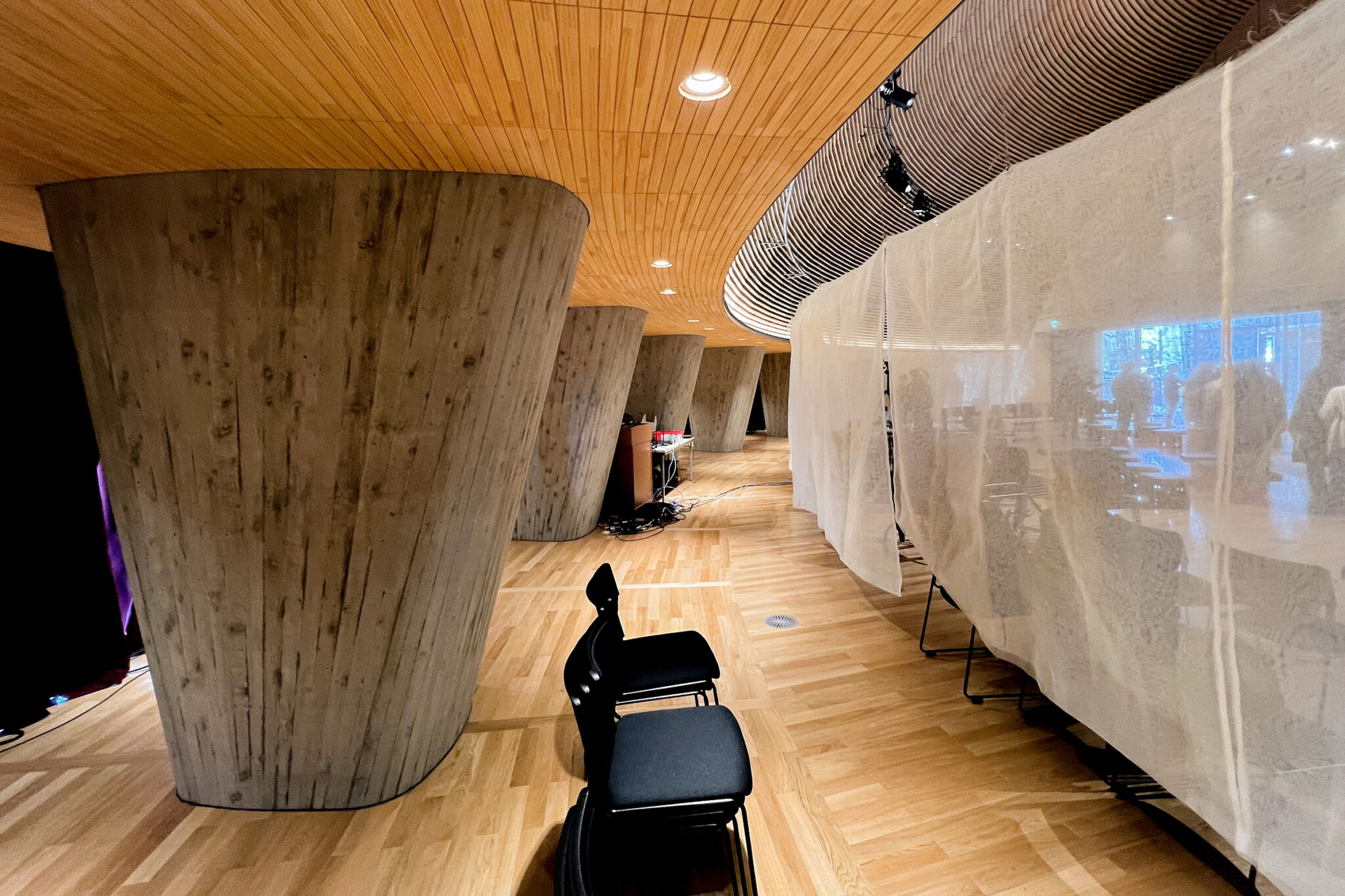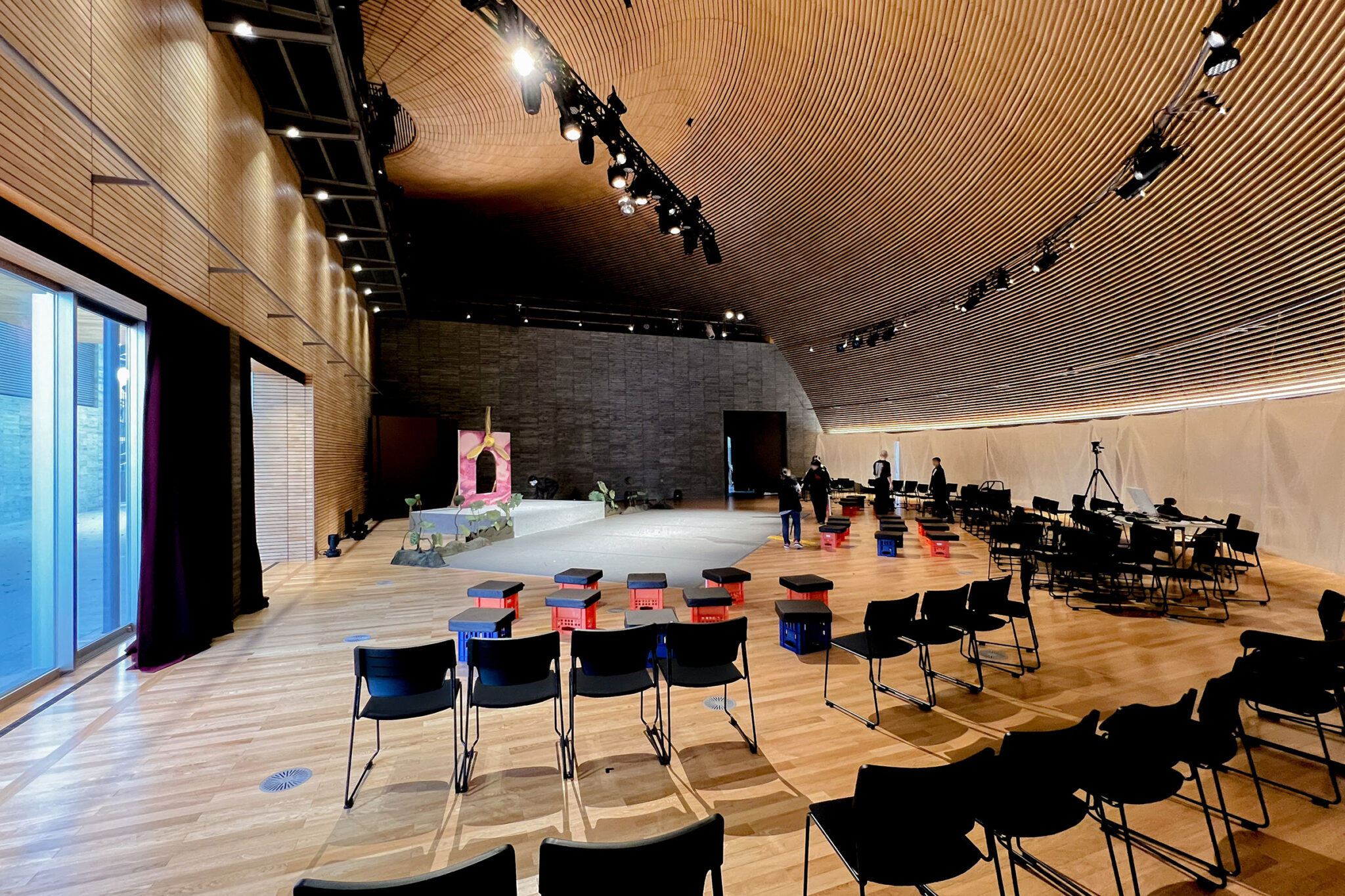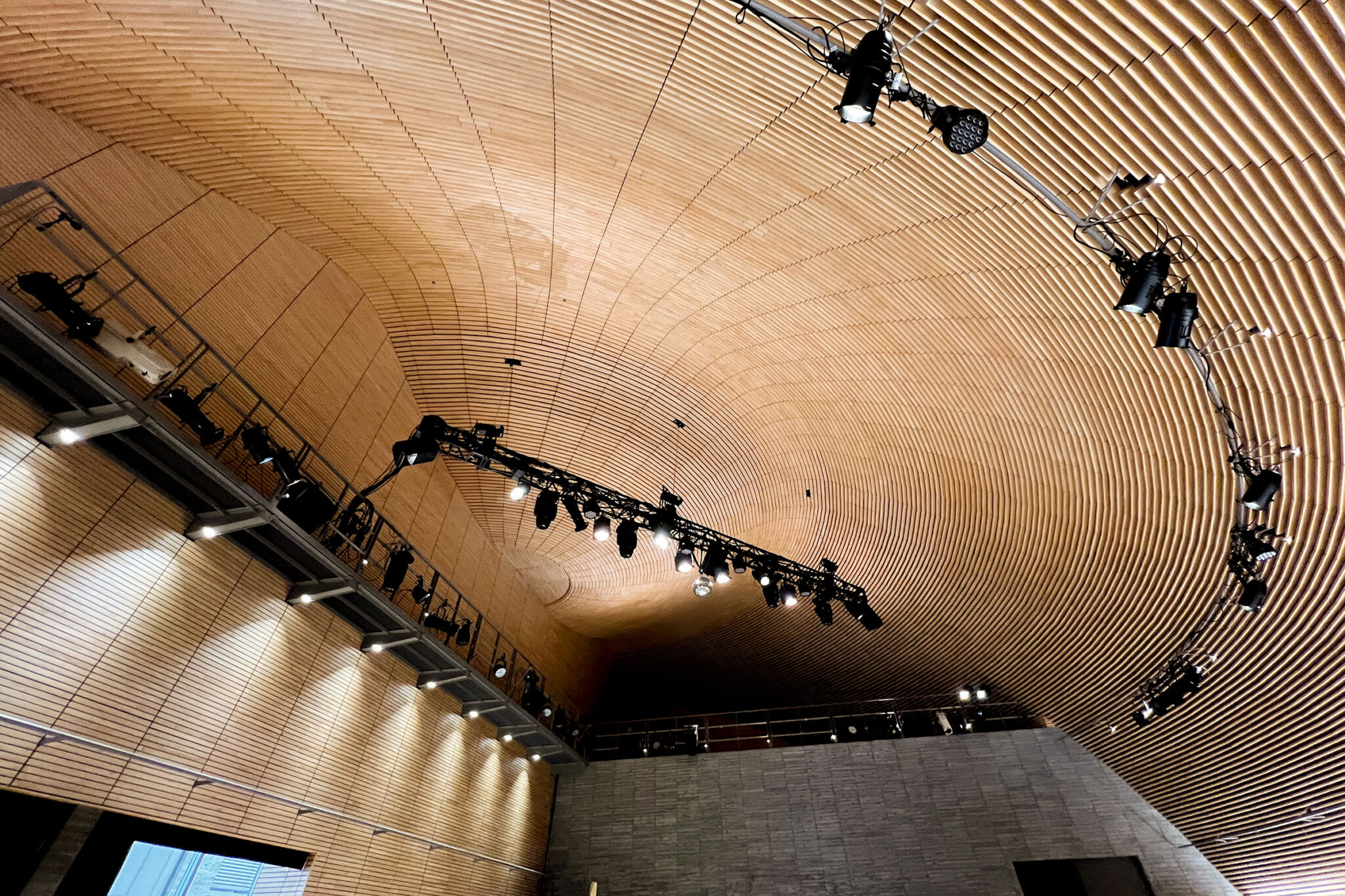 この屋根の下、学生たちが集い、演劇や音楽などの催しができる空間です。ギャラリーが開放的なのとは対照的に、こちらは、守られ、包み込まれるような空間になっています。