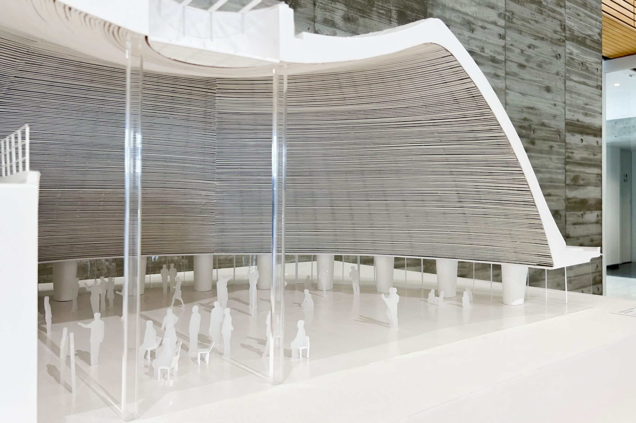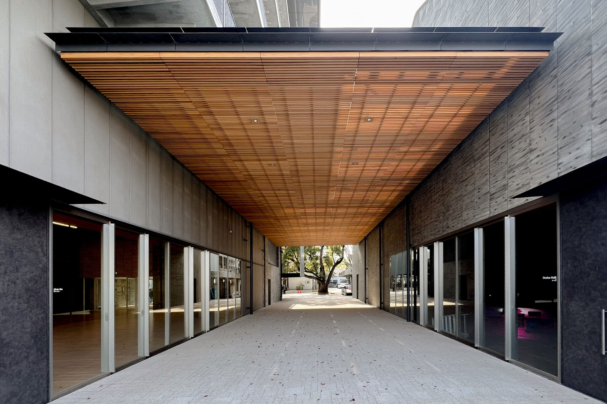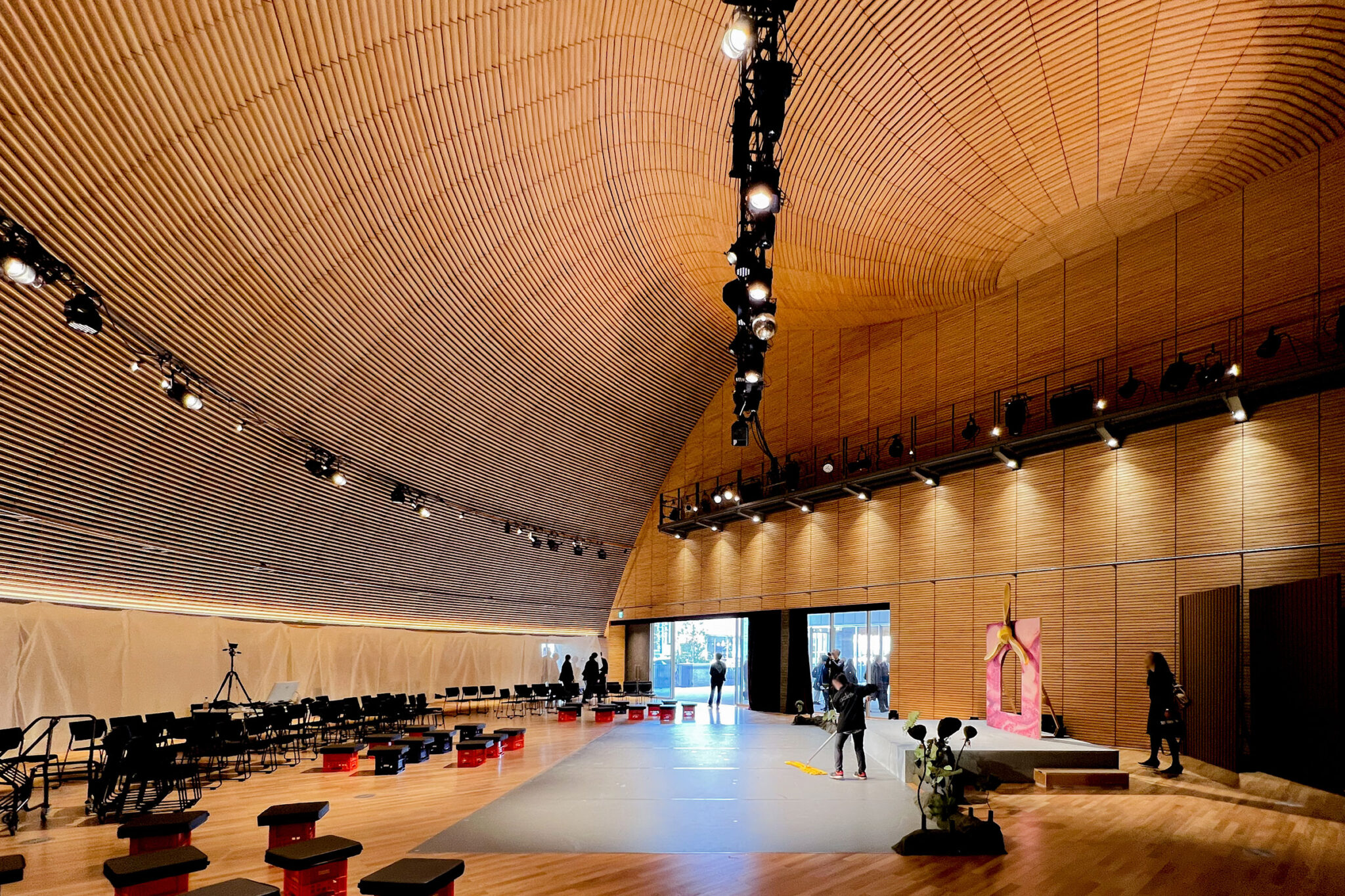 この屋根の下、学生たちが集い、演劇や音楽などの催しができる空間です。ギャラリーが開放的なのとは対照的に、こちらは、守られ、包み込まれるような空間になっています。
