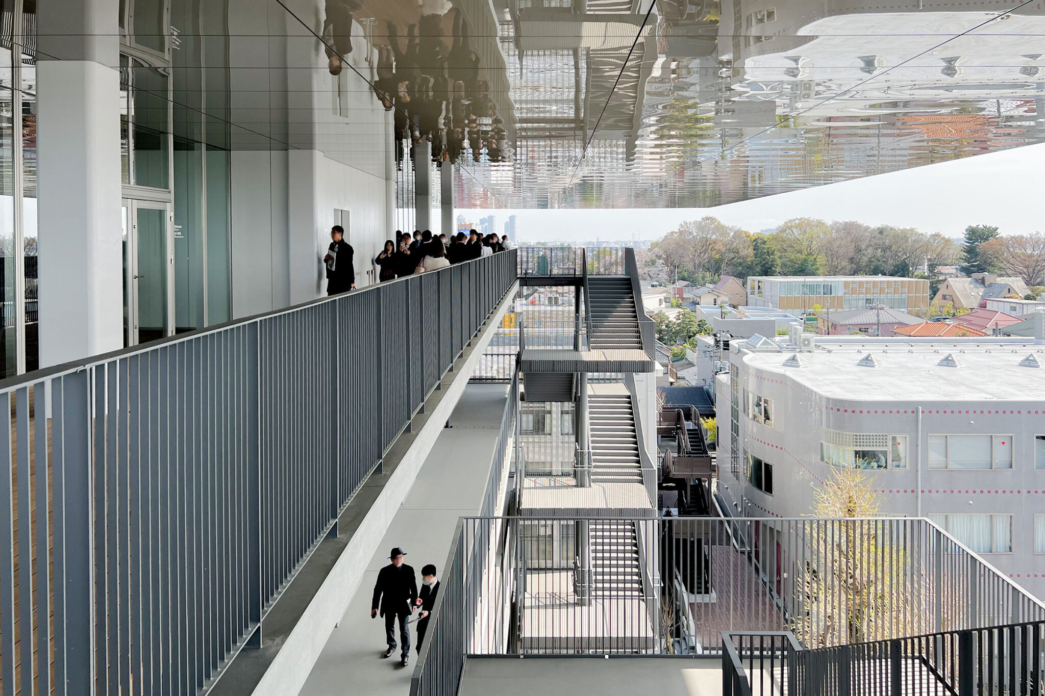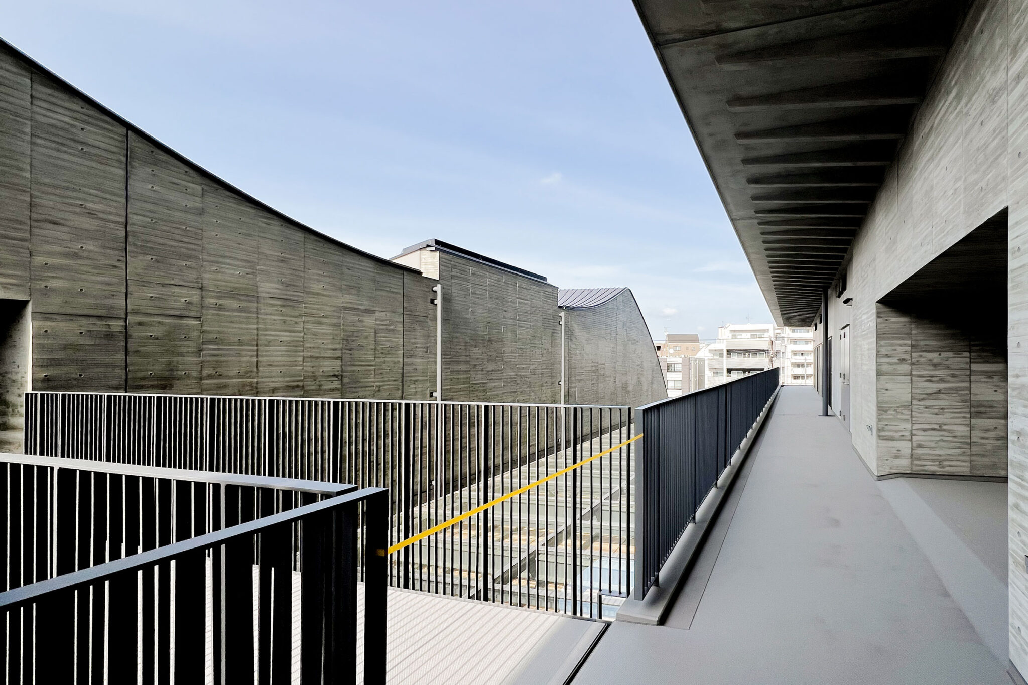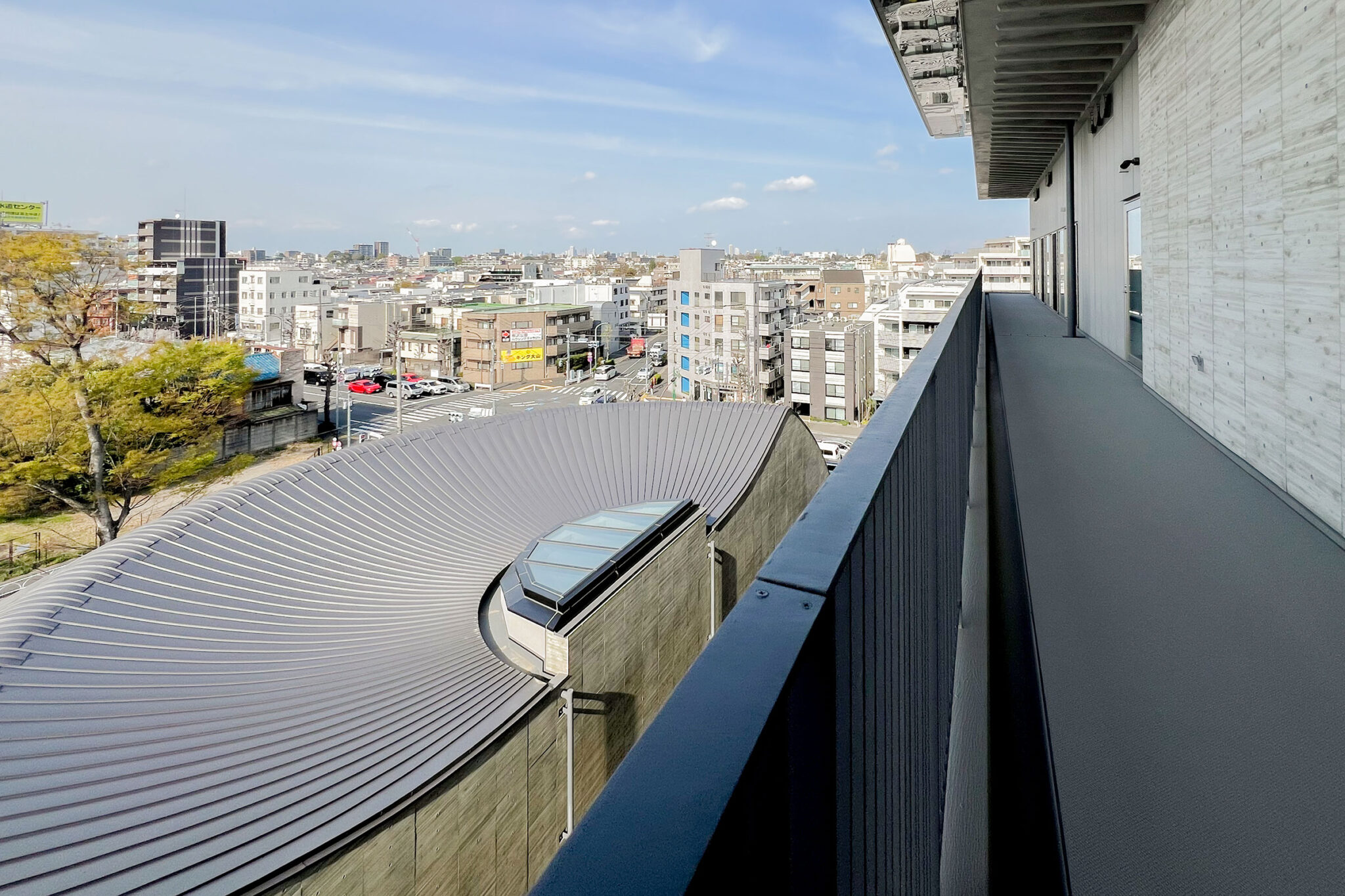 内藤廣建築設計事務所による、東京・世田谷区の「多摩美術大学 上野毛キャンパス新棟」。講義室・ギャラリー・講堂などを内包する施設。“雨露を凌ぐ清朗な覆い”となる大屋根があり、“競い合い、絆を結ぶ”ための交流テラスを備えた建築を考案。講堂は目に止まるように“お椀を伏せた”様な形態とする4階、バルコニー photo©architecturephoto