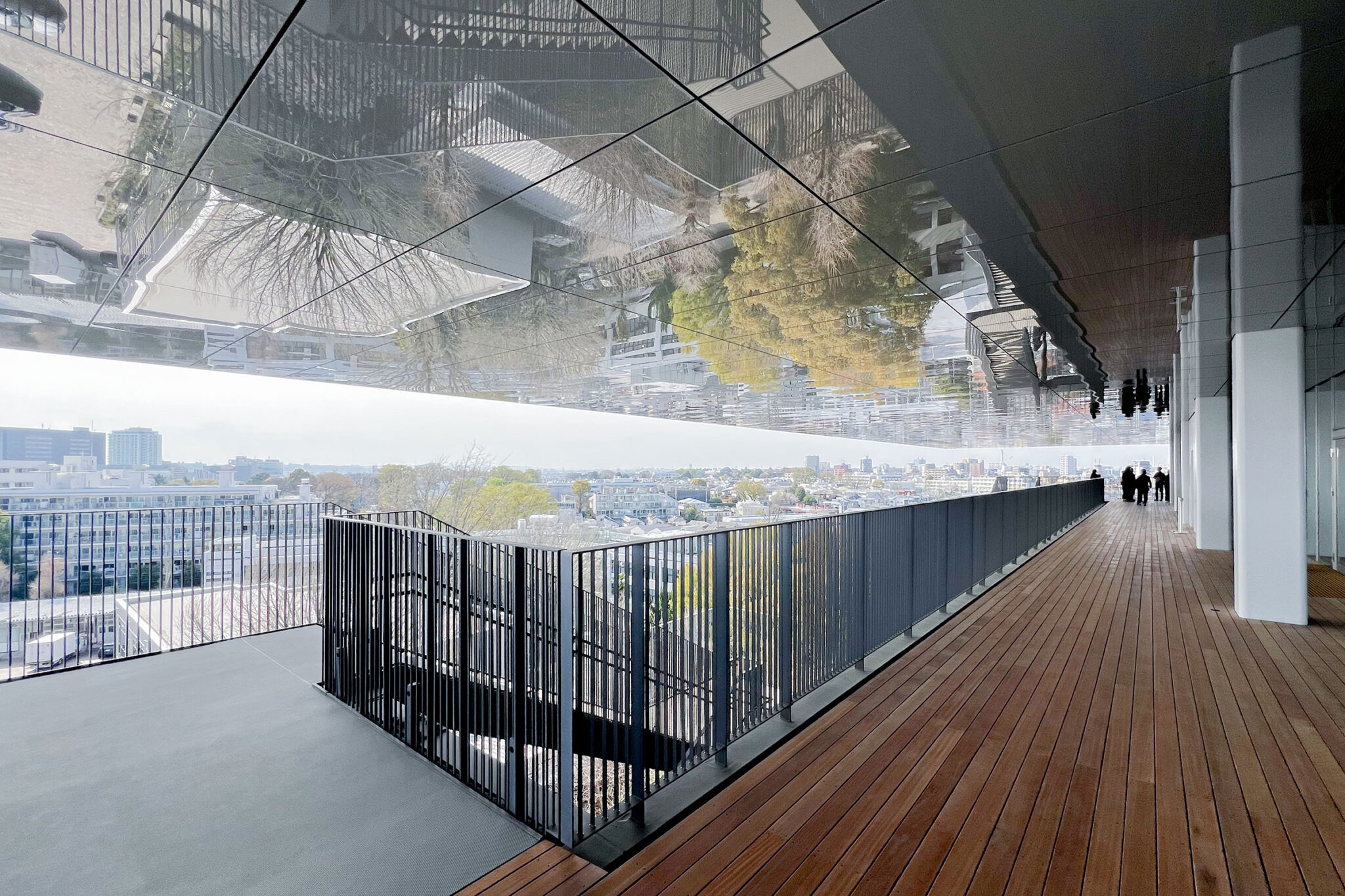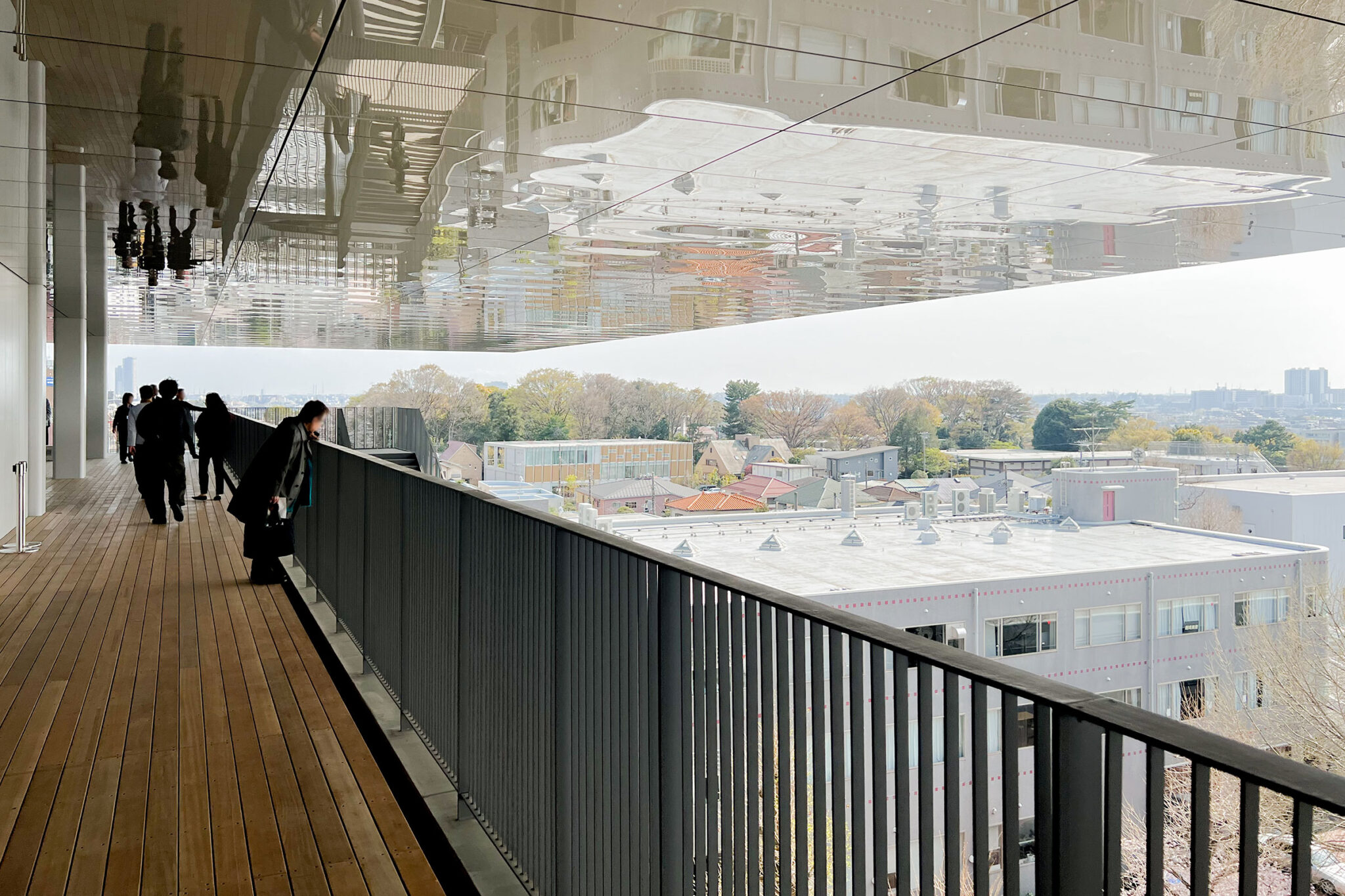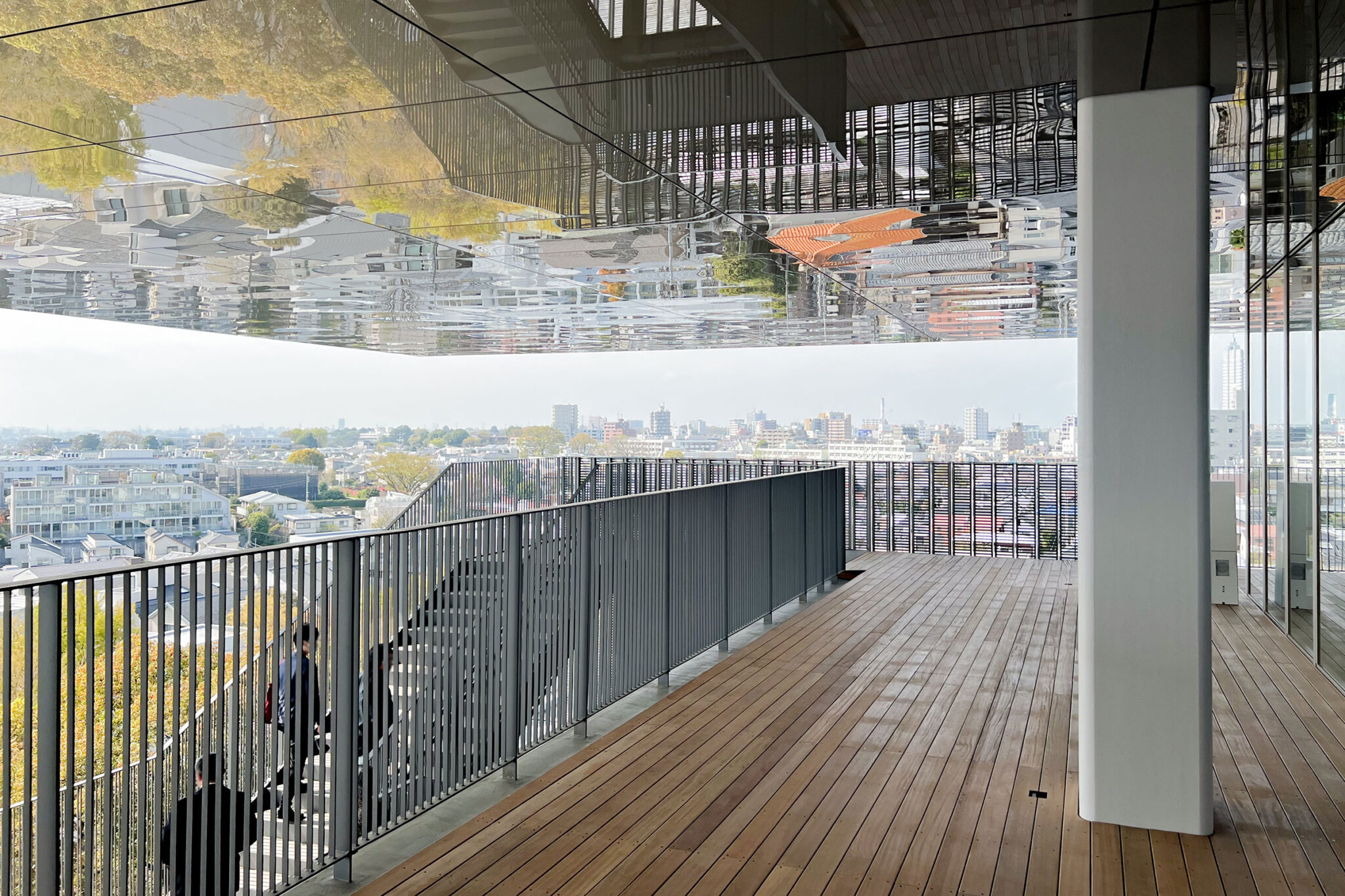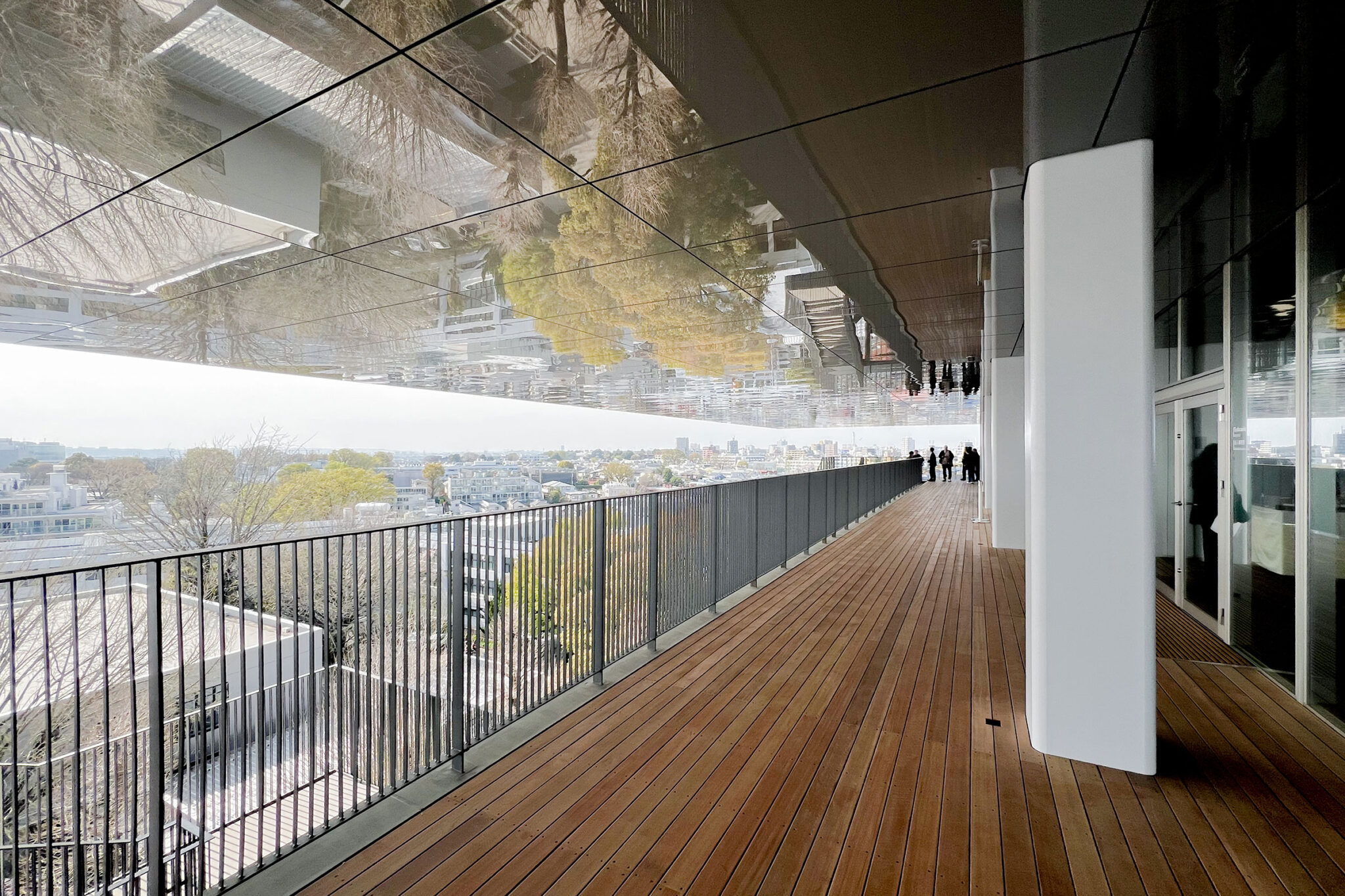 内藤廣建築設計事務所による、東京・世田谷区の「多摩美術大学 上野毛キャンパス新棟」。講義室・ギャラリー・講堂などを内包する施設。“雨露を凌ぐ清朗な覆い”となる大屋根があり、“競い合い、絆を結ぶ”ための交流テラスを備えた建築を考案。講堂は目に止まるように“お椀を伏せた”様な形態とする4階、バルコニー photo©architecturephoto