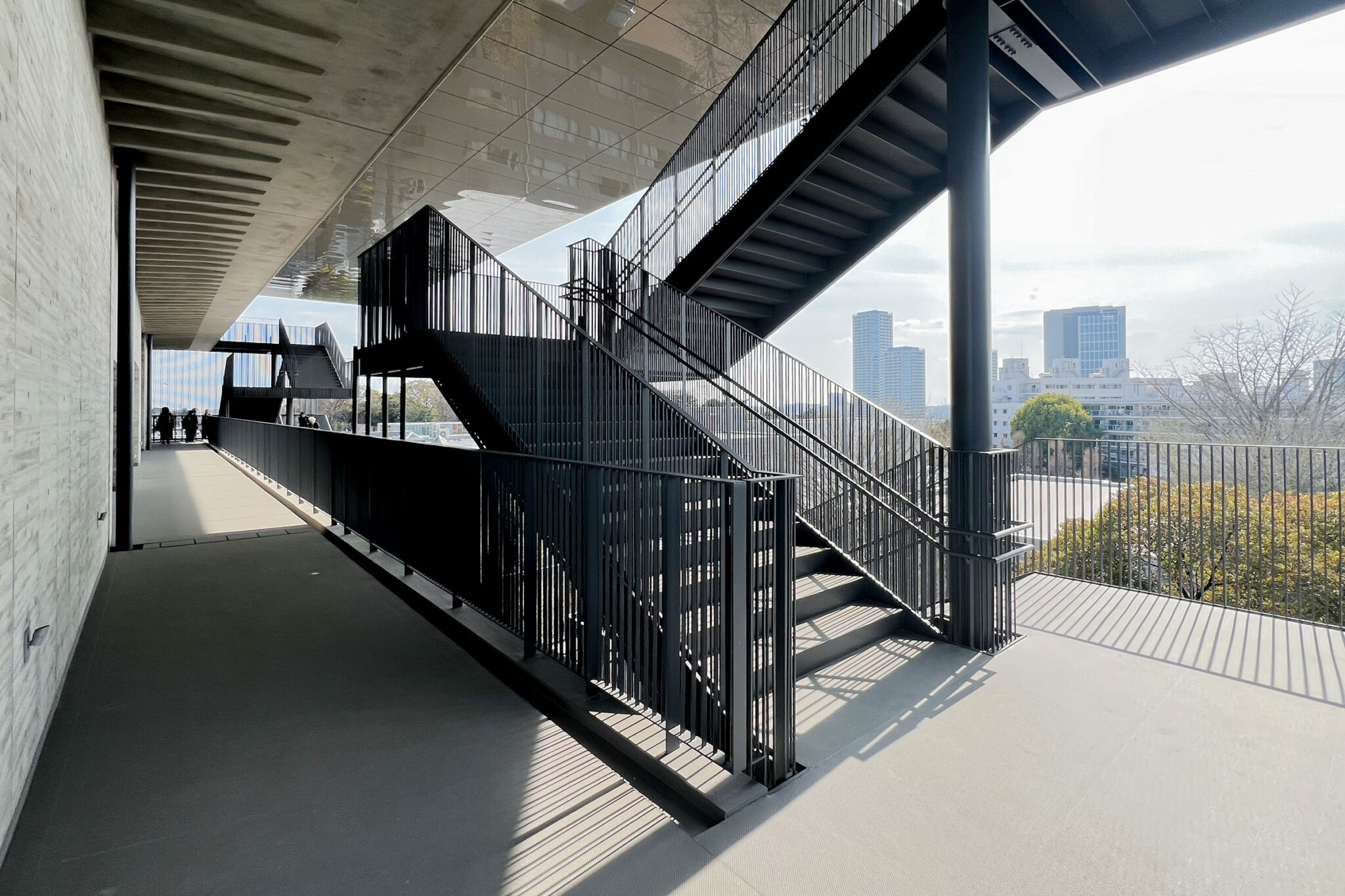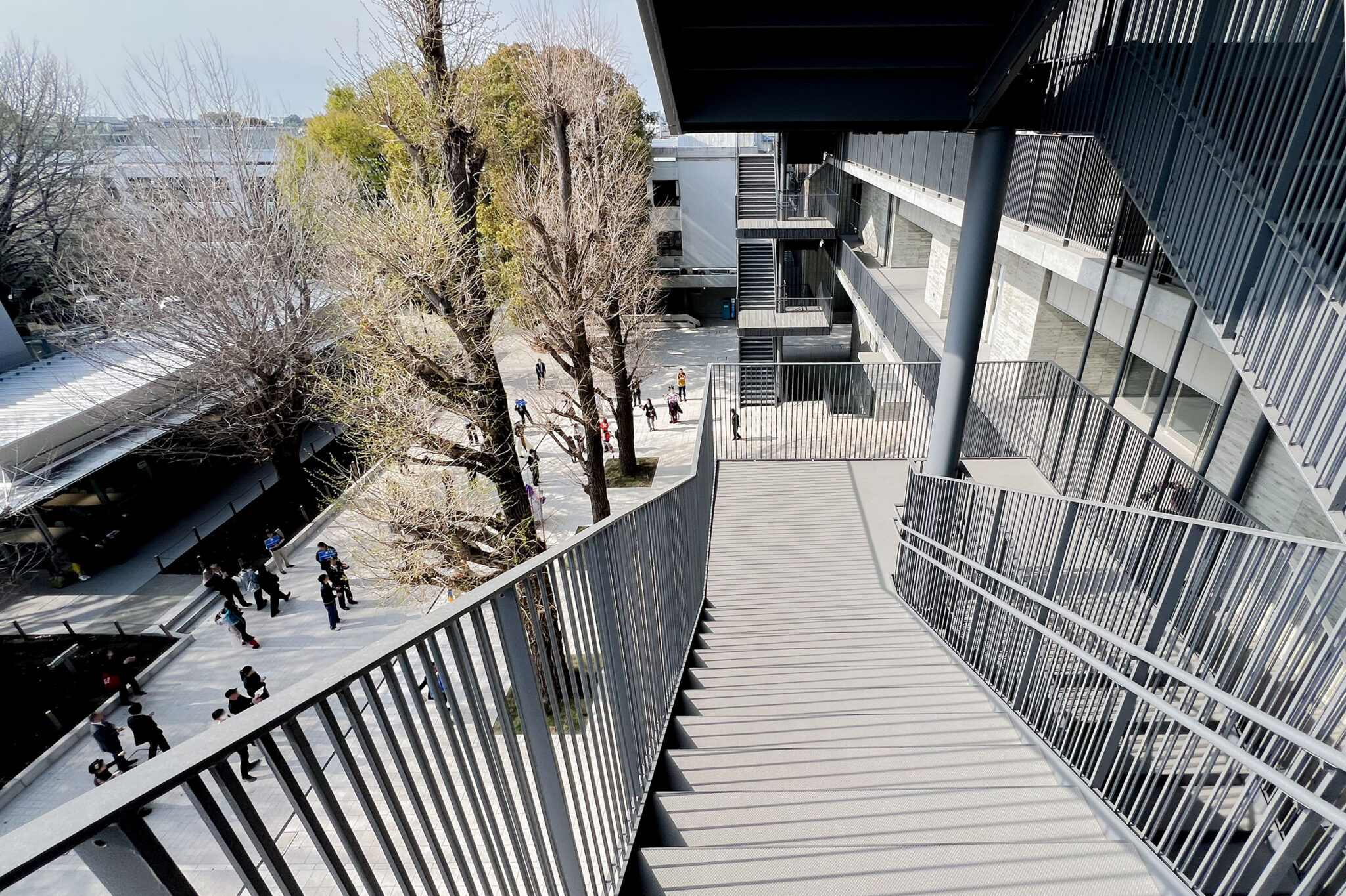 内藤廣建築設計事務所による、東京・世田谷区の「多摩美術大学 上野毛キャンパス新棟」。講義室・ギャラリー・講堂などを内包する施設。“雨露を凌ぐ清朗な覆い”となる大屋根があり、“競い合い、絆を結ぶ”ための交流テラスを備えた建築を考案。講堂は目に止まるように“お椀を伏せた”様な形態とする2階から3階への屋外階段 photo©architecturephoto