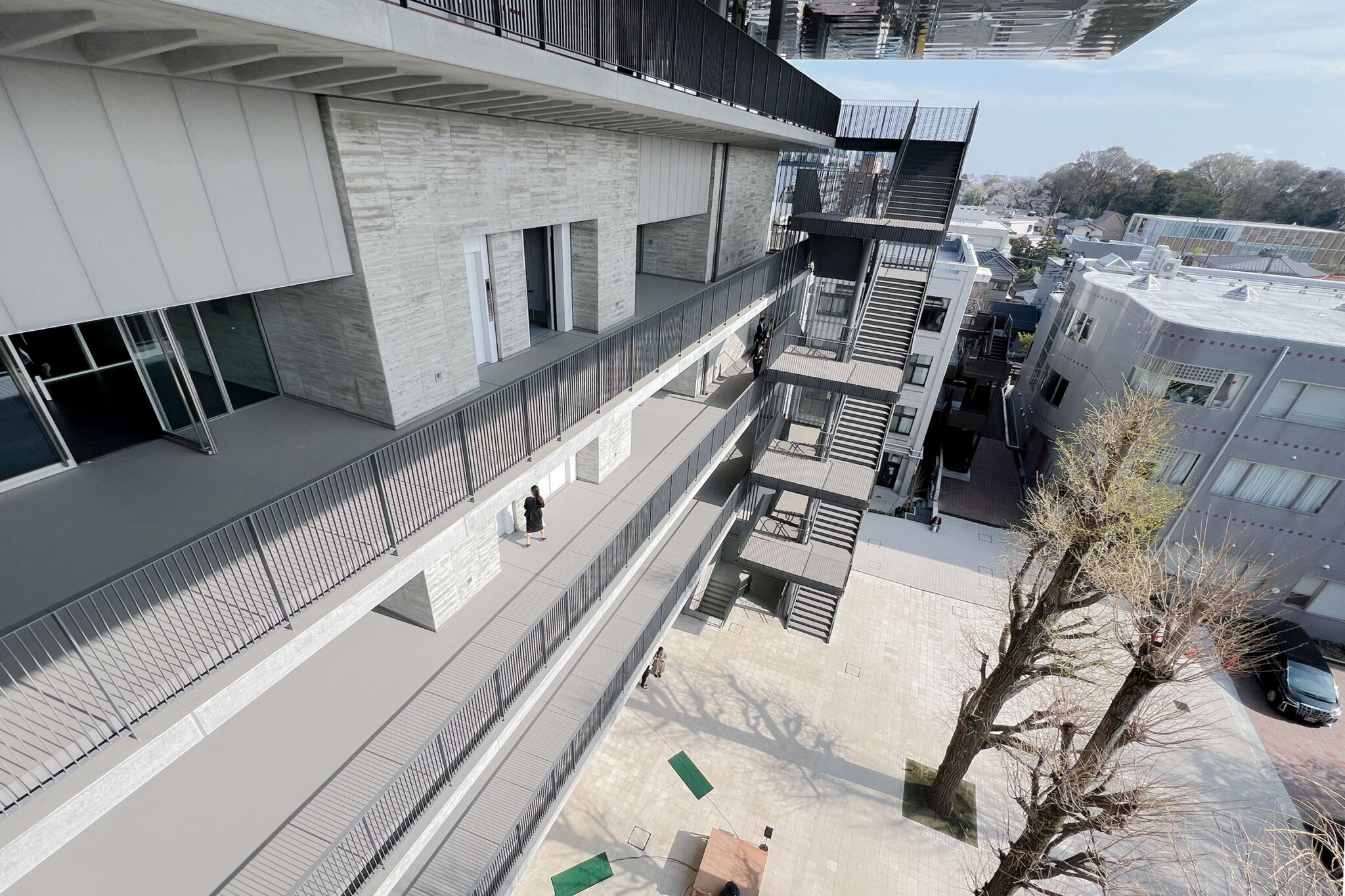 内藤廣建築設計事務所による、東京・世田谷区の「多摩美術大学 上野毛キャンパス新棟」。講義室・ギャラリー・講堂などを内包する施設。“雨露を凌ぐ清朗な覆い”となる大屋根があり、“競い合い、絆を結ぶ”ための交流テラスを備えた建築を考案。講堂は目に止まるように“お椀を伏せた”様な形態とする4階から5階への屋外階段の踊り場から中庭を見下ろす。 photo©architecturephoto