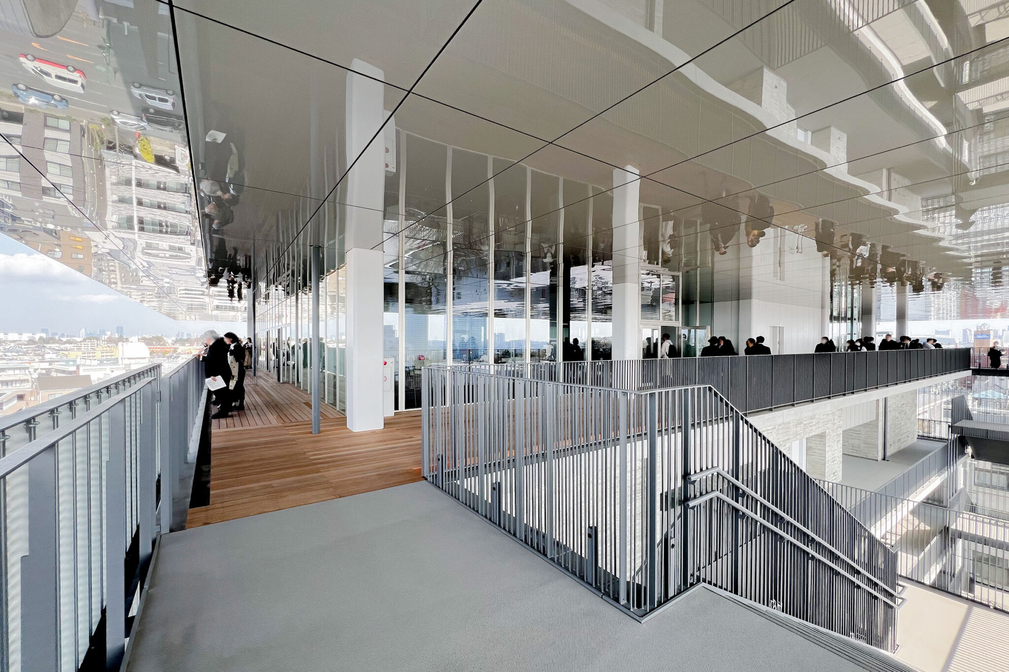 内藤廣建築設計事務所による、東京・世田谷区の「多摩美術大学 上野毛キャンパス新棟」。講義室・ギャラリー・講堂などを内包する施設。“雨露を凌ぐ清朗な覆い”となる大屋根があり、“競い合い、絆を結ぶ”ための交流テラスを備えた建築を考案。講堂は目に止まるように“お椀を伏せた”様な形態とする5階、バルコニー photo©architecturephoto