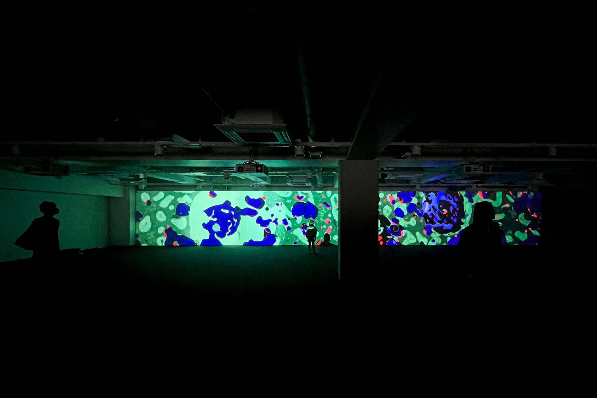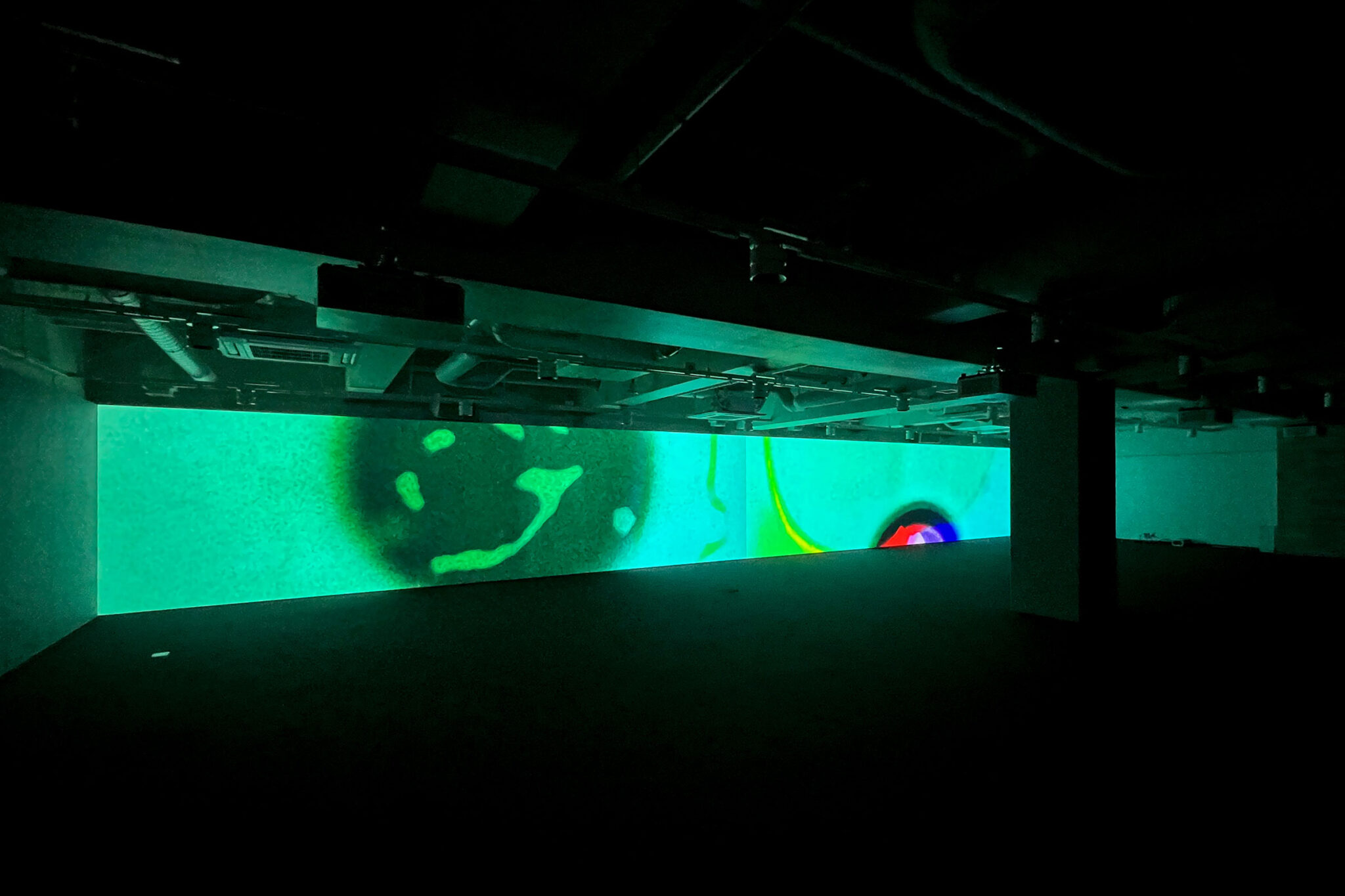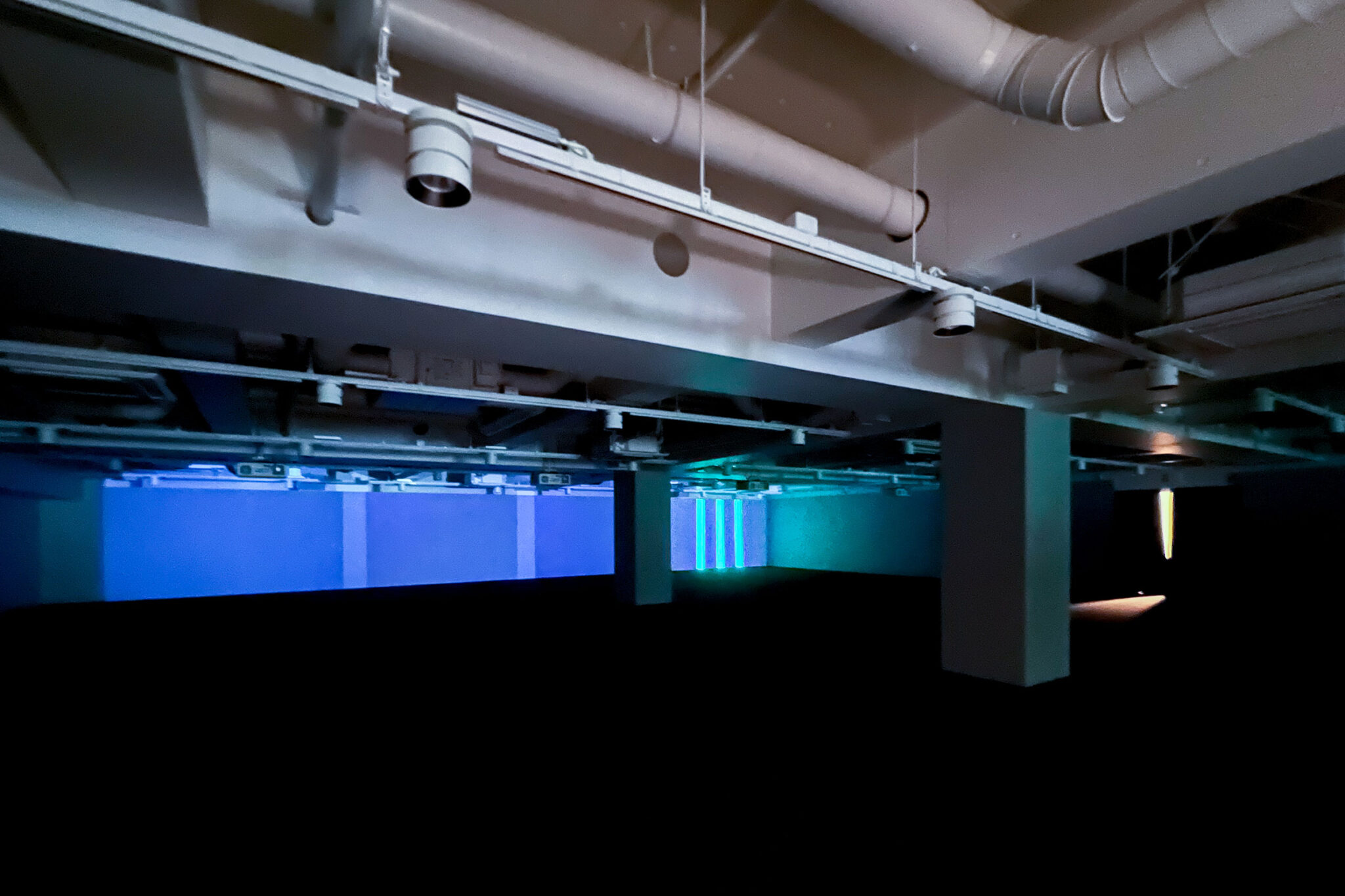 内藤廣建築設計事務所による、東京・世田谷区の「多摩美術大学 上野毛キャンパス新棟」。講義室・ギャラリー・講堂などを内包する施設。“雨露を凌ぐ清朗な覆い”となる大屋根があり、“競い合い、絆を結ぶ”ための交流テラスを備えた建築を考案。講堂は目に止まるように“お椀を伏せた”様な形態とする地下1階、メディアラボ(映像作品 「hello world」 by qubibi、2010‐2026) photo©architecturephoto