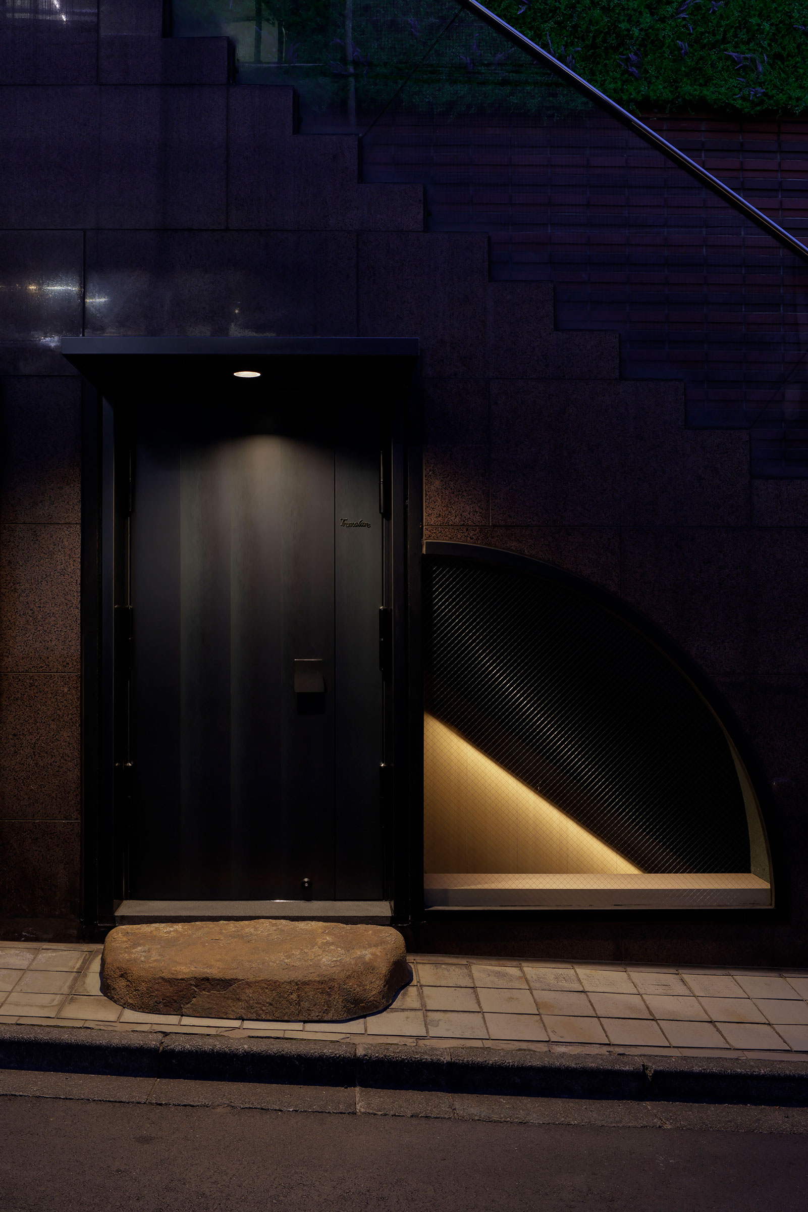 佐野文彦 / Fumihiko Sano Studioによる、東京・港区の飲食店「Tremolare」。既存が“採石場”の様だった空間に計画。躯体の量塊の関係性や重量感を活かしつつ、自然素材のカウンターや什器で“素材感や軽さ”を導入して全体を構築。個室では弧状の天井と丸い壁面で中心性と一体感を生む外観、前面道路からエントランス部分を見る。 photo©adhoc 志摩大輔