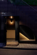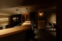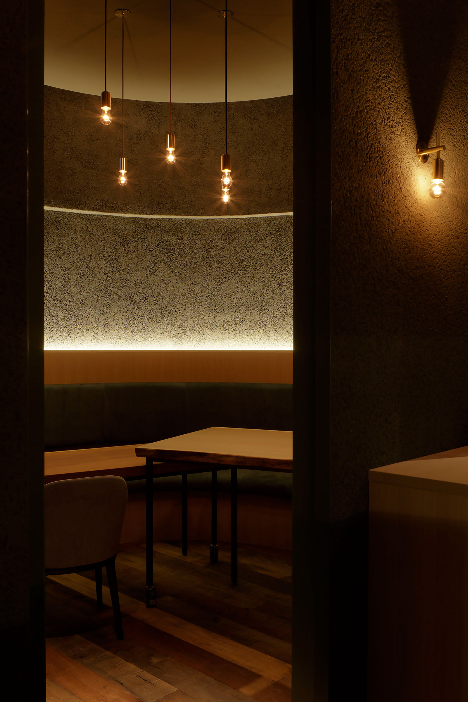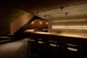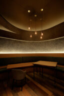 既存が“採石場”の様だった空間に計画されました。建築家は、躯体の量塊の関係性や重量感を活かしつつ、自然素材のカウンターや什器で“素材感や軽さ”を導入して全体を構築しました。また、個室では弧状の天井と丸い壁面で中心性と一体感を生みだします。店舗の場所はこちら(Google Map)。