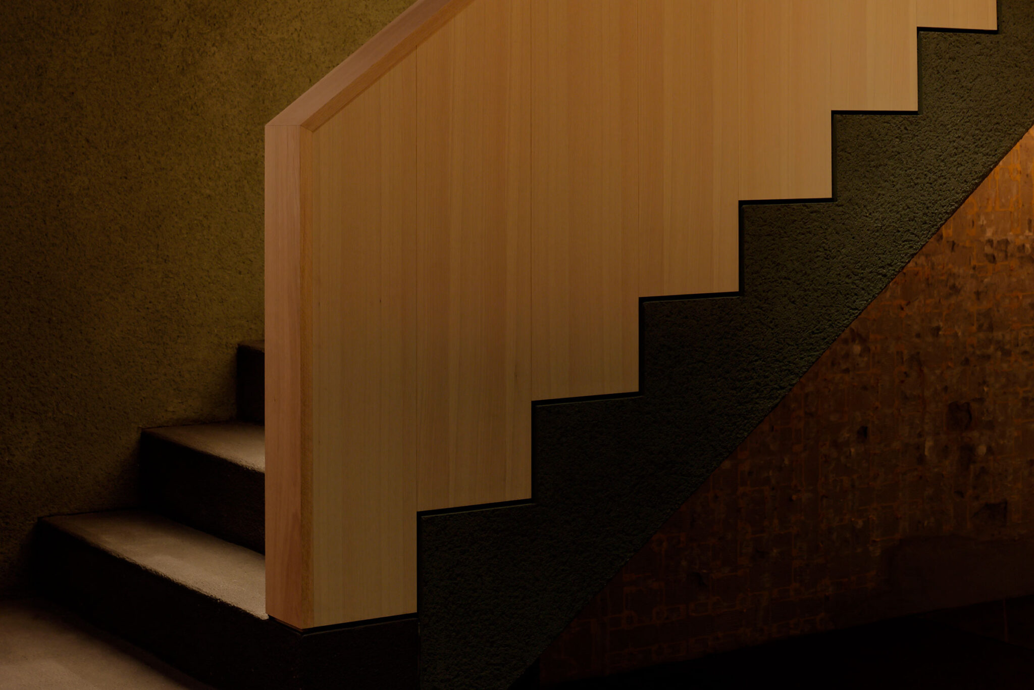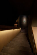 佐野文彦 / Fumihiko Sano Studioによる、東京・港区の飲食店「Tremolare」。既存が“採石場”の様だった空間に計画。躯体の量塊の関係性や重量感を活かしつつ、自然素材のカウンターや什器で“素材感や軽さ”を導入して全体を構築。個室では弧状の天井と丸い壁面で中心性と一体感を生む地下1階、階段の詳細 photo©adhoc 志摩大輔