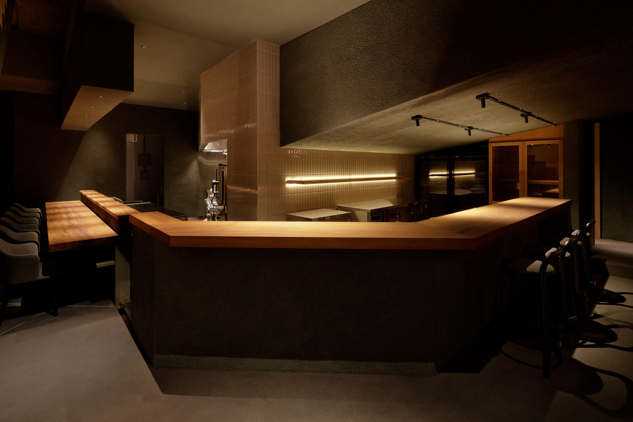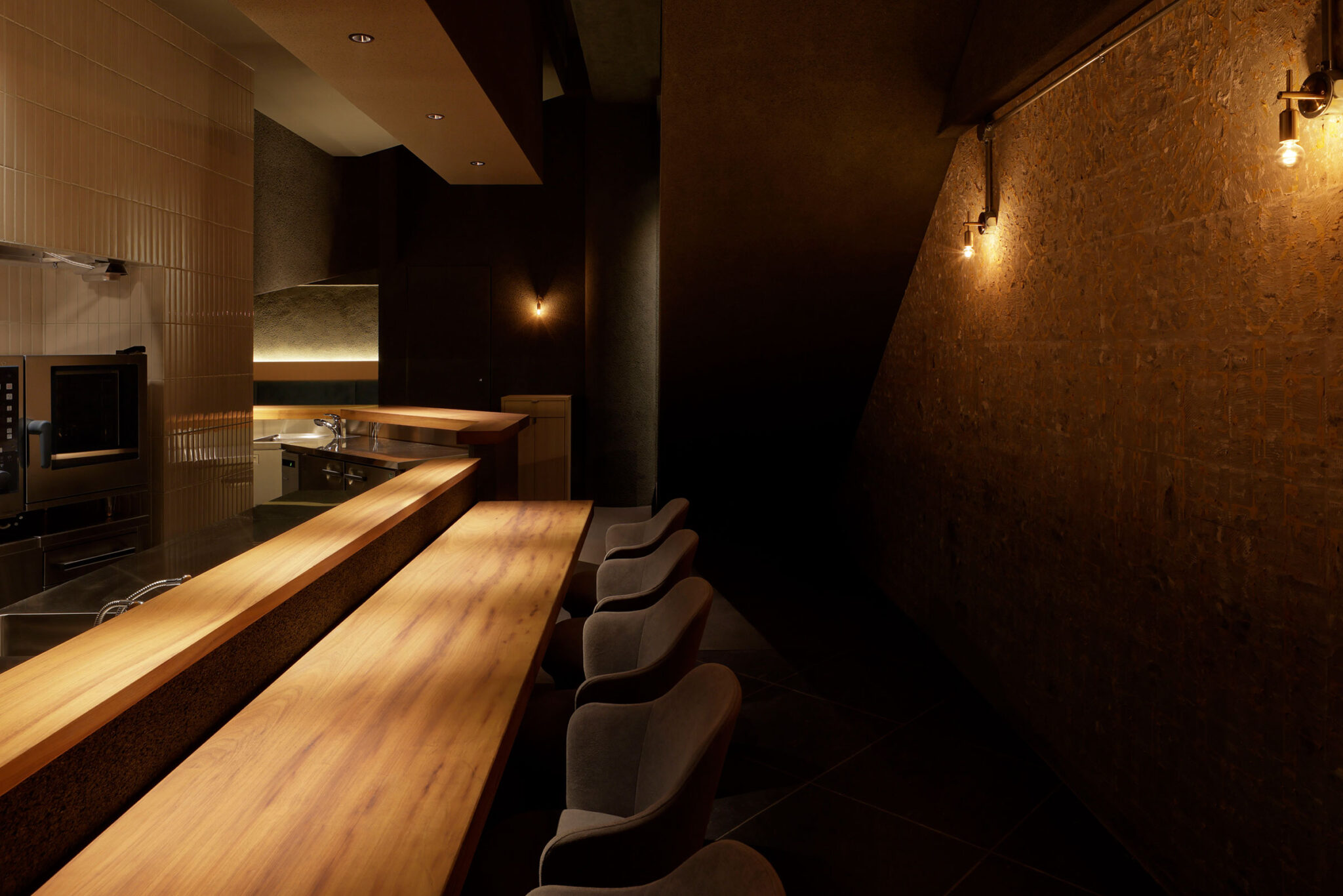 佐野文彦 / Fumihiko Sano Studioによる、東京・港区の飲食店「Tremolare」。既存が“採石場”の様だった空間に計画。躯体の量塊の関係性や重量感を活かしつつ、自然素材のカウンターや什器で“素材感や軽さ”を導入して全体を構築。個室では弧状の天井と丸い壁面で中心性と一体感を生む地下1階、サブカウンター photo©adhoc 志摩大輔