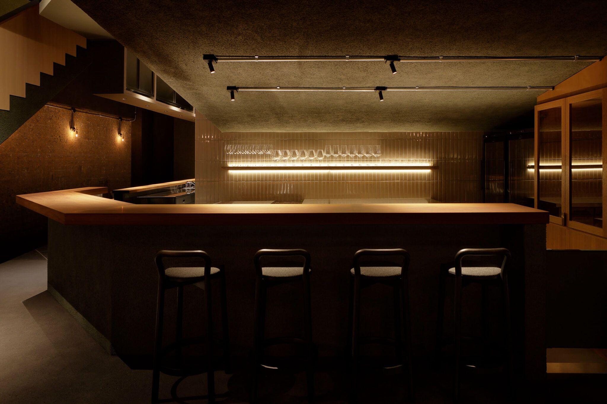 佐野文彦 / Fumihiko Sano Studioによる、東京・港区の飲食店「Tremolare」。既存が“採石場”の様だった空間に計画。躯体の量塊の関係性や重量感を活かしつつ、自然素材のカウンターや什器で“素材感や軽さ”を導入して全体を構築。個室では弧状の天井と丸い壁面で中心性と一体感を生む地下1階、階段側からサブカウンターを見る。 photo©adhoc 志摩大輔