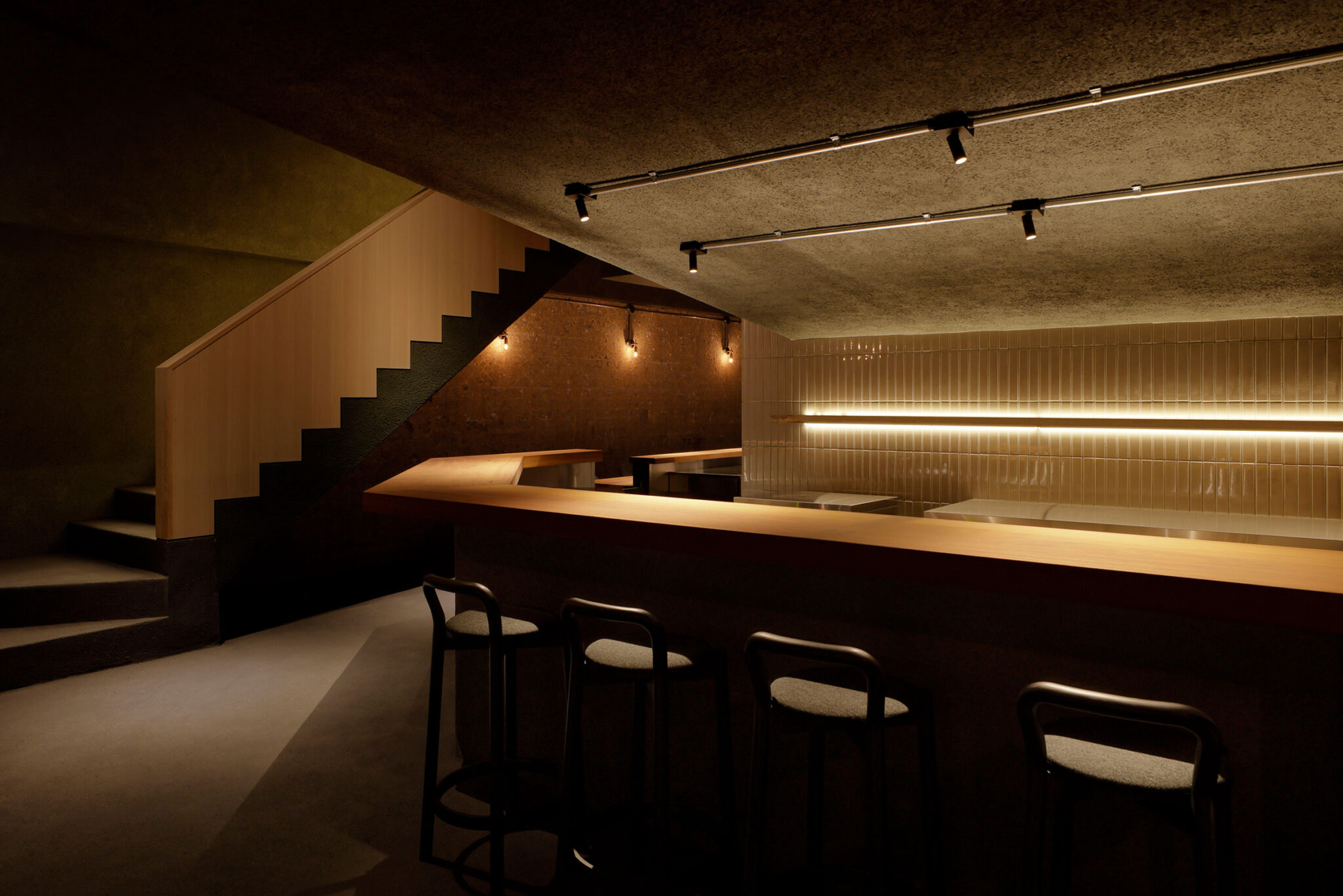 佐野文彦 / Fumihiko Sano Studioによる、東京・港区の飲食店「Tremolare」。既存が“採石場”の様だった空間に計画。躯体の量塊の関係性や重量感を活かしつつ、自然素材のカウンターや什器で“素材感や軽さ”を導入して全体を構築。個室では弧状の天井と丸い壁面で中心性と一体感を生む地下1階、階段側からカウンターを見る。 photo©adhoc 志摩大輔