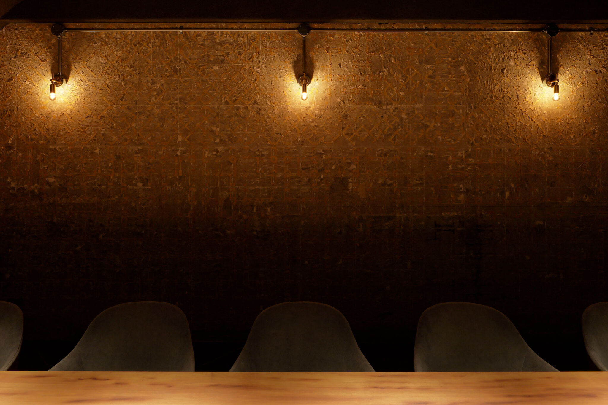 佐野文彦 / Fumihiko Sano Studioによる、東京・港区の飲食店「Tremolare」。既存が“採石場”の様だった空間に計画。躯体の量塊の関係性や重量感を活かしつつ、自然素材のカウンターや什器で“素材感や軽さ”を導入して全体を構築。個室では弧状の天井と丸い壁面で中心性と一体感を生む地下1階、カウンター背面の照明 photo©adhoc 志摩大輔