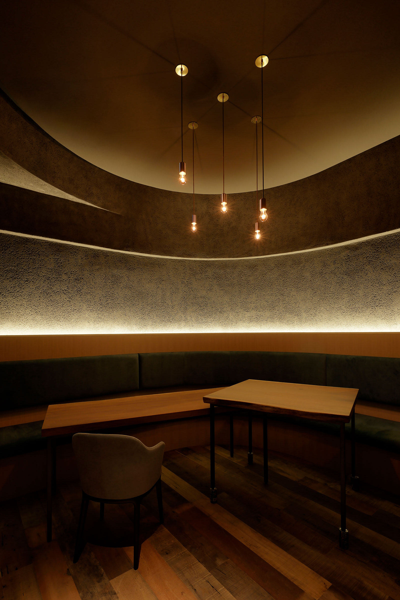 佐野文彦 / Fumihiko Sano Studioによる、東京・港区の飲食店「Tremolare」。既存が“採石場”の様だった空間に計画。躯体の量塊の関係性や重量感を活かしつつ、自然素材のカウンターや什器で“素材感や軽さ”を導入して全体を構築。個室では弧状の天井と丸い壁面で中心性と一体感を生む地下1階、個室 photo©adhoc 志摩大輔