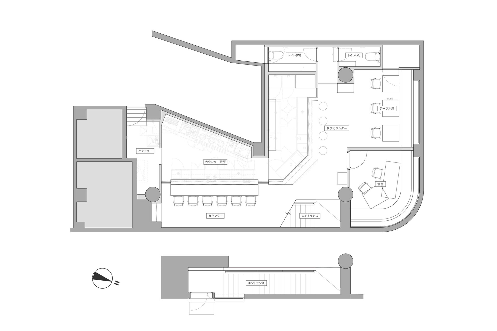 佐野文彦 / Fumihiko Sano Studioによる、東京・港区の飲食店「Tremolare」。既存が“採石場”の様だった空間に計画。躯体の量塊の関係性や重量感を活かしつつ、自然素材のカウンターや什器で“素材感や軽さ”を導入して全体を構築。個室では弧状の天井と丸い壁面で中心性と一体感を生む平面図 image©Fumihiko Sano Studio