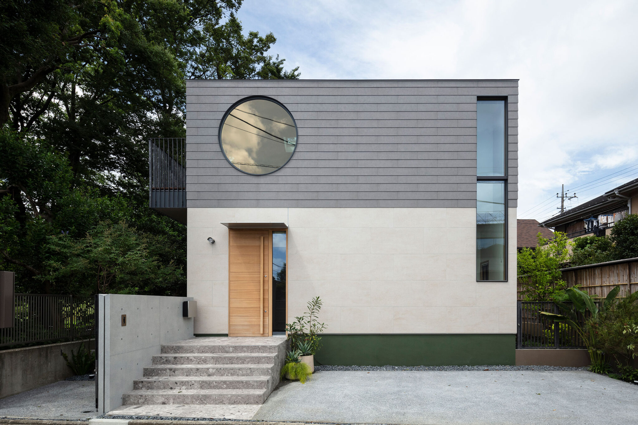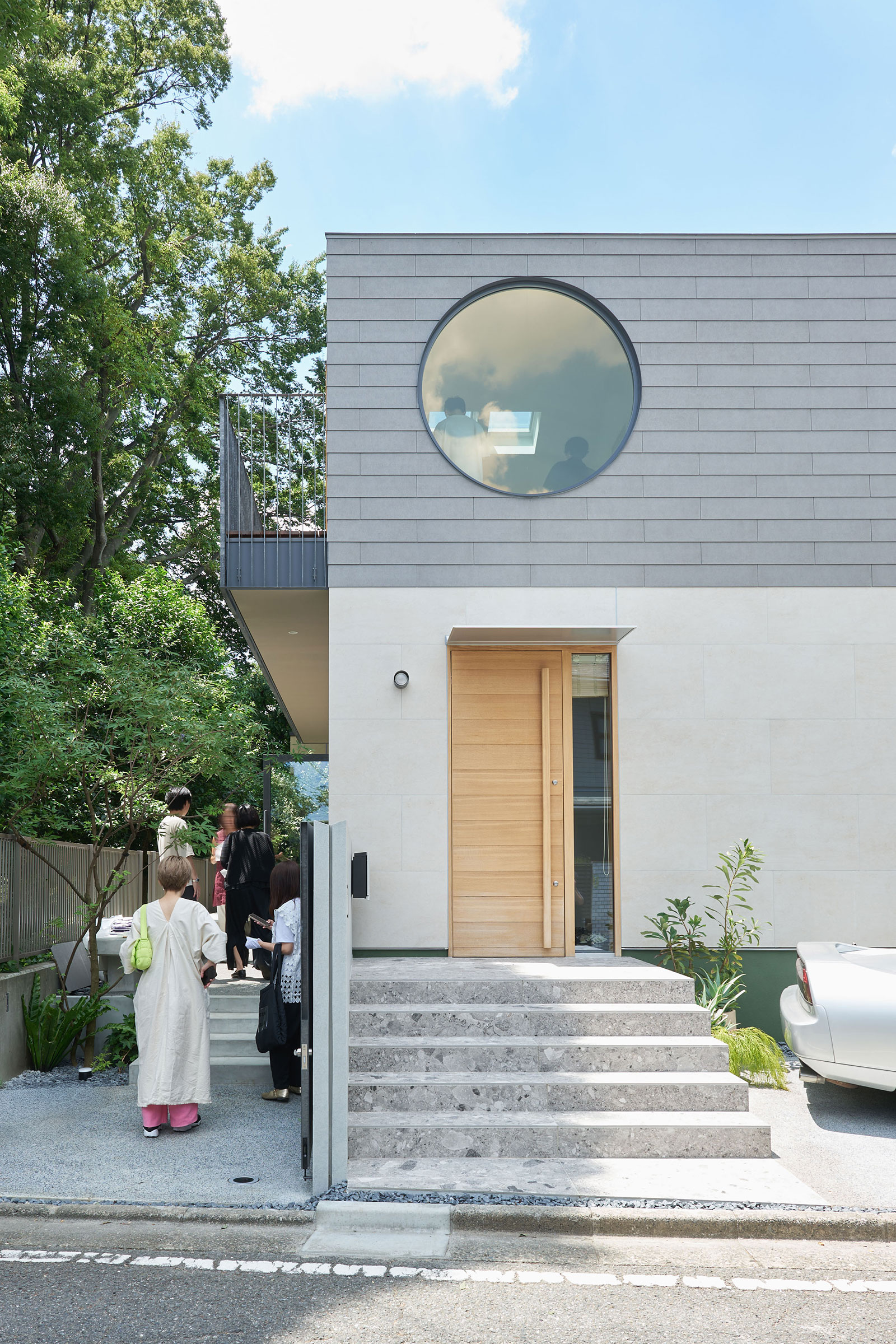 KIAS イシダアーキテクツスタジオによる、東京・杉並区の「善福寺公園の住宅」。公園に面するギャラリー併設の住まい。彫刻のように空間をつくった後に構造を形成する設計で、豊かな空間につながる“心地よいずれ”を備えた建築を構築。外部では9mのベンチで地域に“ソーシャルな場”も提供 2階、リビングから円形の開口部越しに外部を見る。 photo©山内紀人