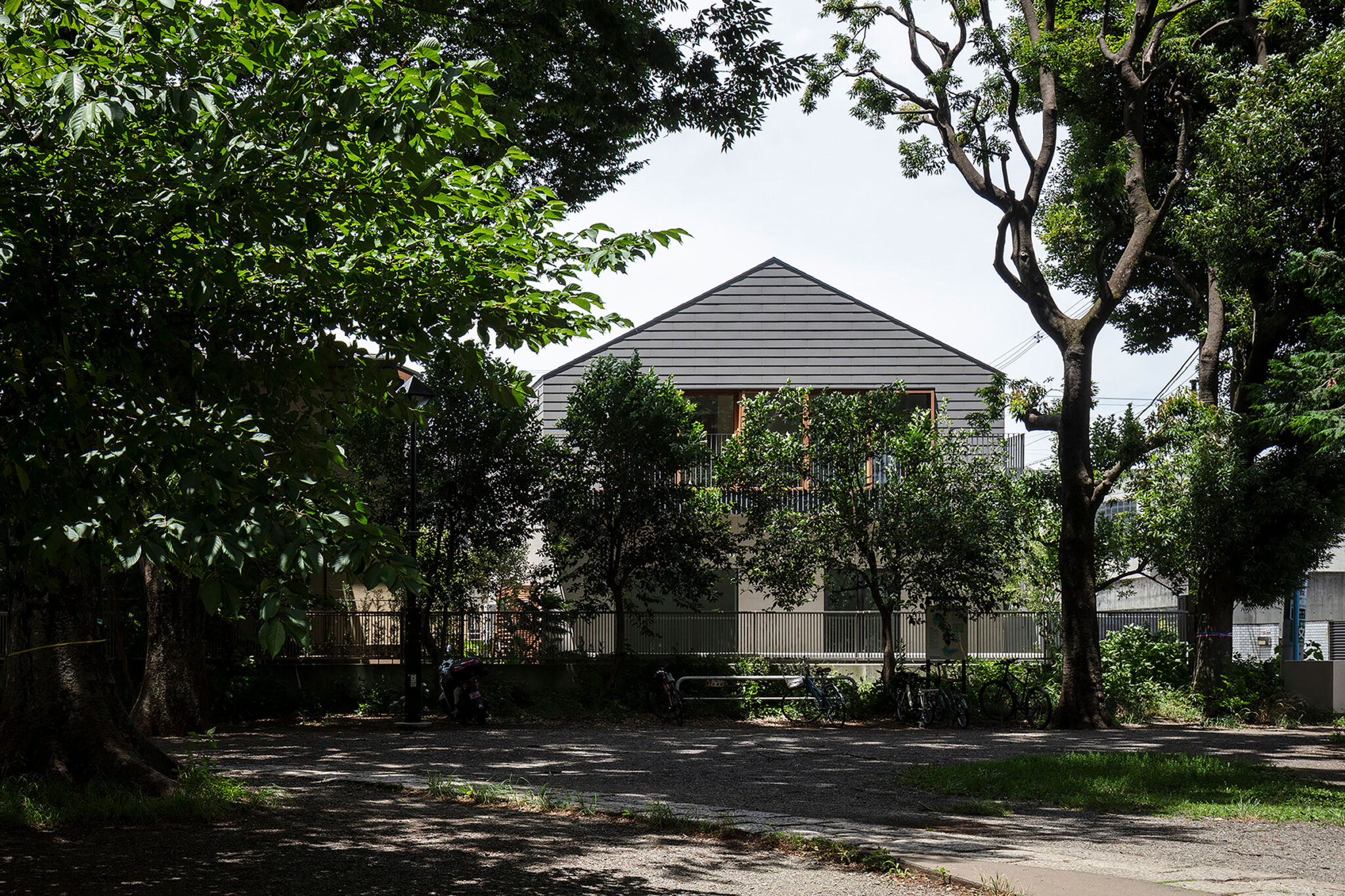 KIAS イシダアーキテクツスタジオによる、東京・杉並区の「善福寺公園の住宅」。公園に面するギャラリー併設の住まい。彫刻のように空間をつくった後に構造を形成する設計で、豊かな空間につながる“心地よいずれ”を備えた建築を構築。外部では9mのベンチで地域に“ソーシャルな場”も提供 外観、南東側の公園より見る。 photo©山内紀人