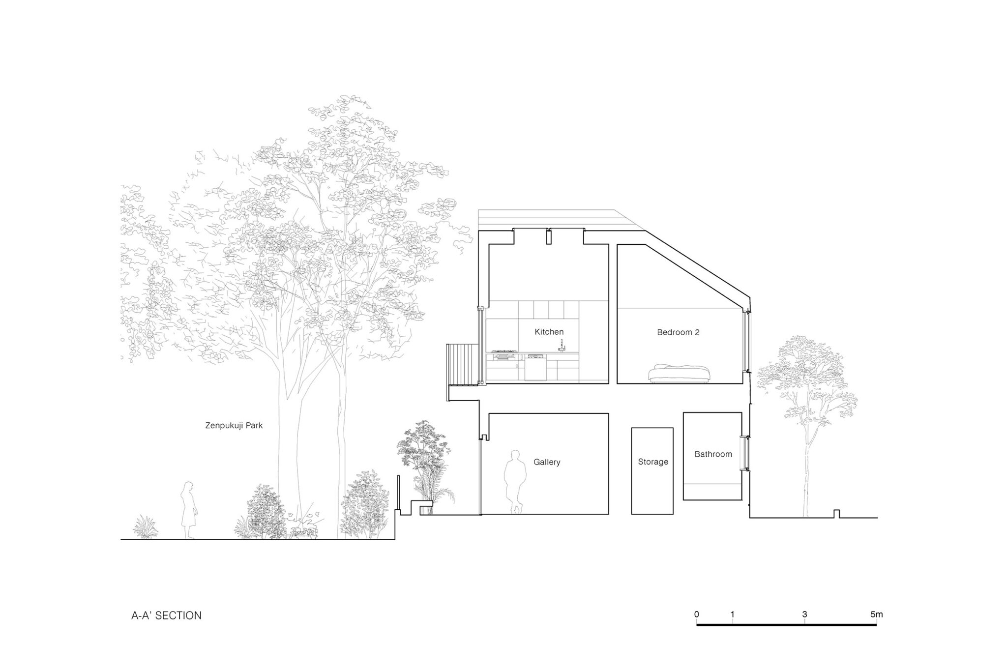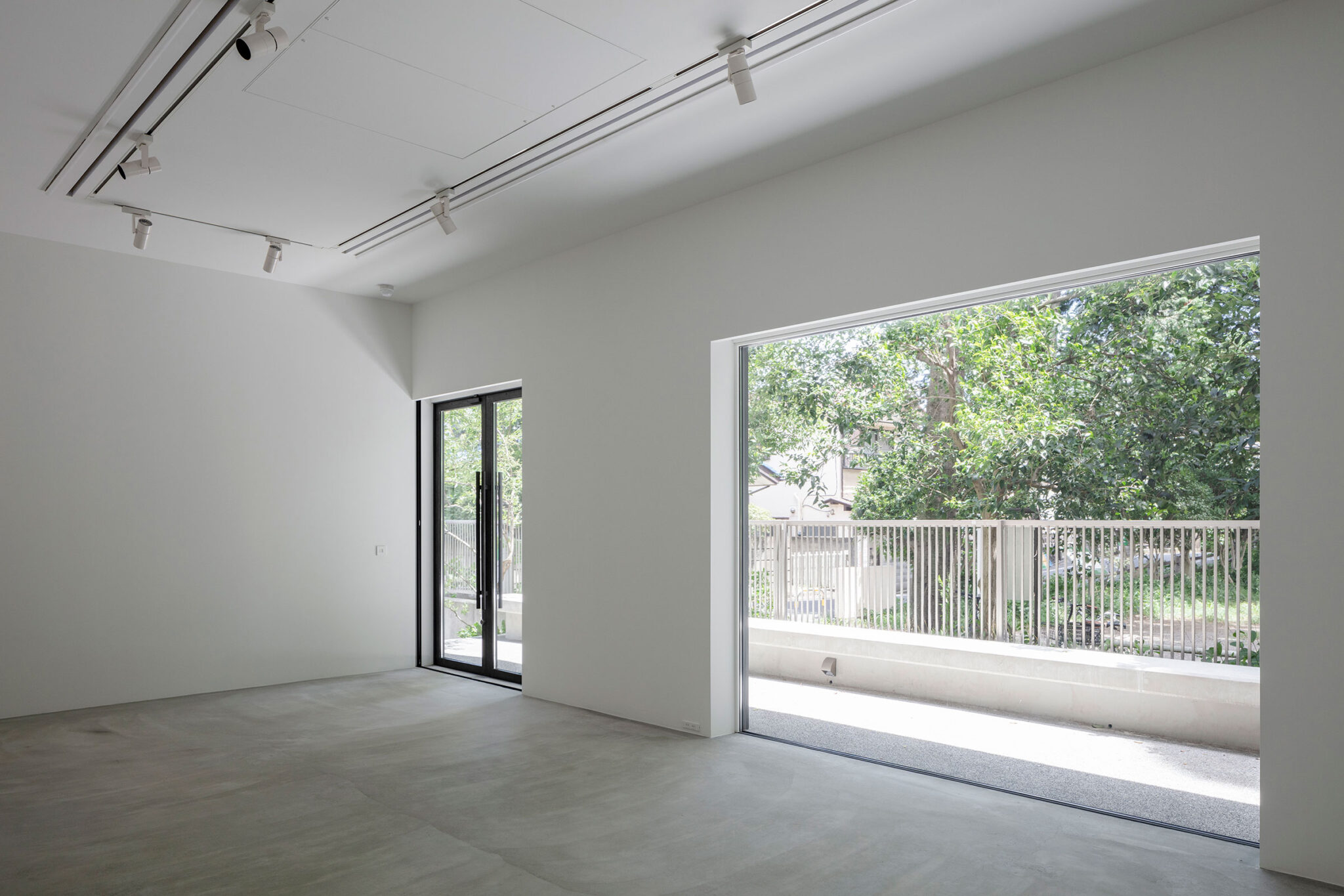 The design of this residence began with carefully shaping living spaces that open toward the lush scenery of Zenpukuji Park. The first floor houses a small rental gallery space open as a venue for emerging artists, while the second floor accommodates the owner’s living quarters.