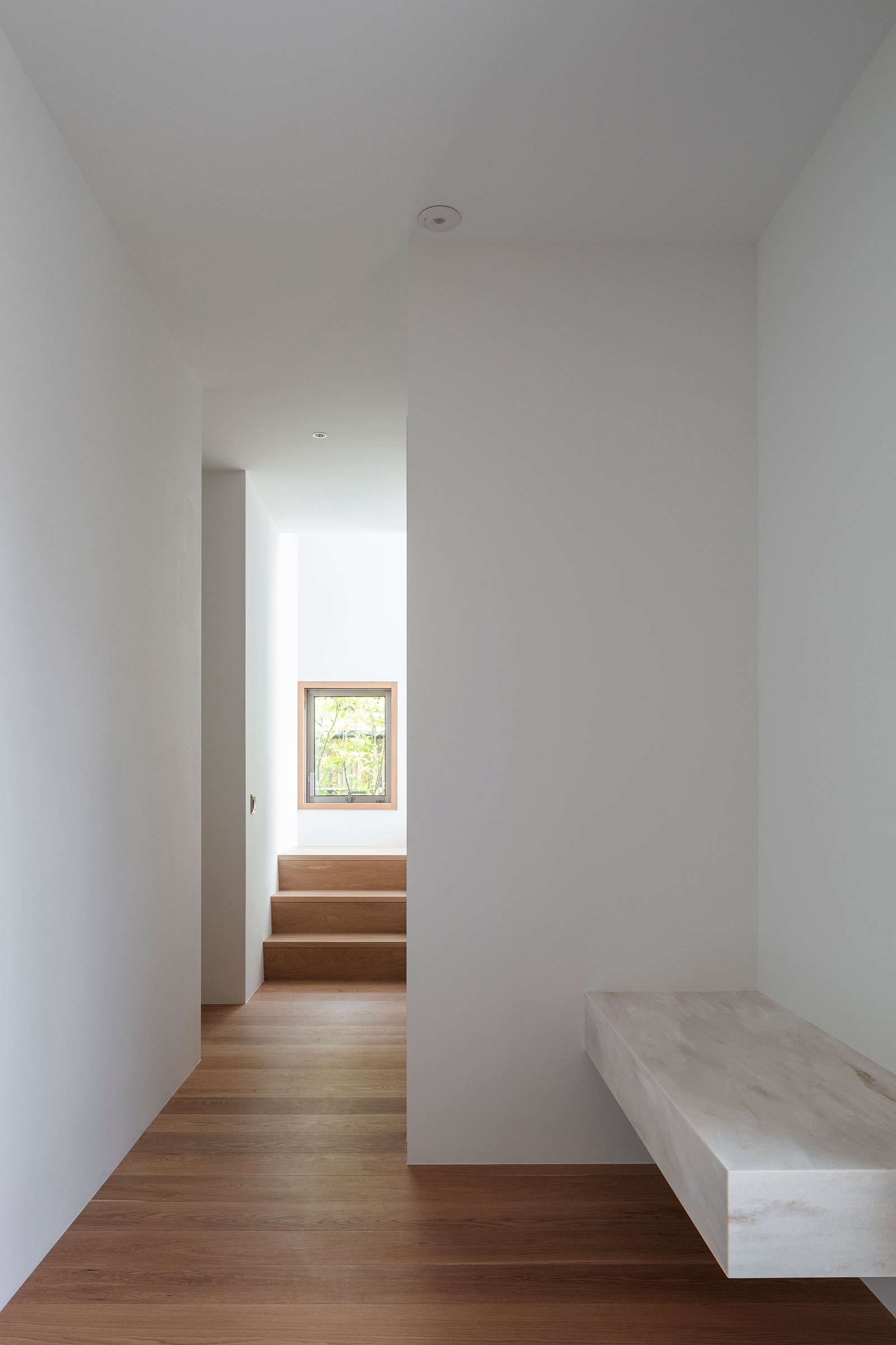 KIAS イシダアーキテクツスタジオによる、東京・杉並区の「善福寺公園の住宅」。公園に面するギャラリー併設の住まい。彫刻のように空間をつくった後に構造を形成する設計で、豊かな空間につながる“心地よいずれ”を備えた建築を構築。外部では9mのベンチで地域に“ソーシャルな場”も提供 1階、エントランスから2階への階段側を見る。 photo©山内紀人