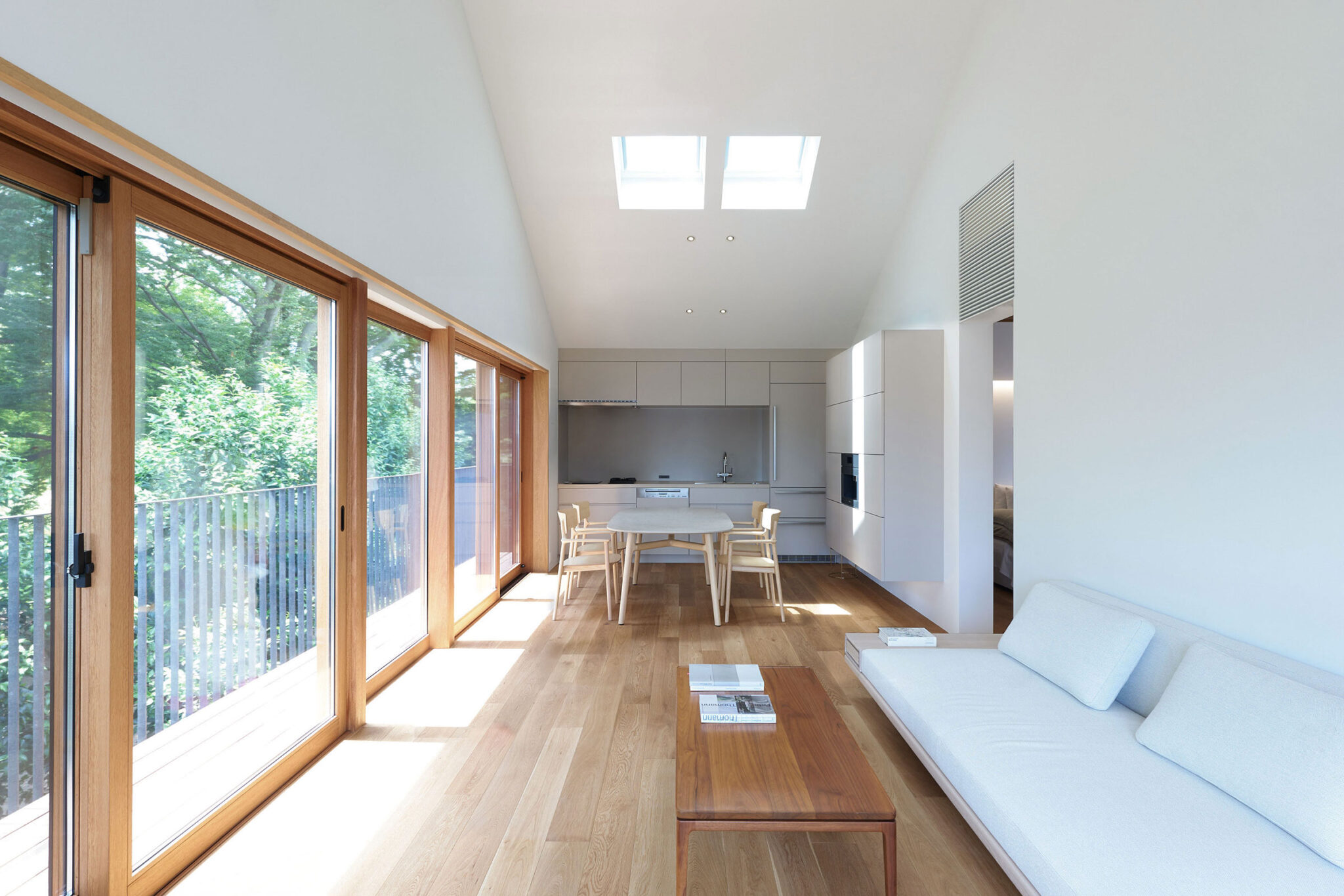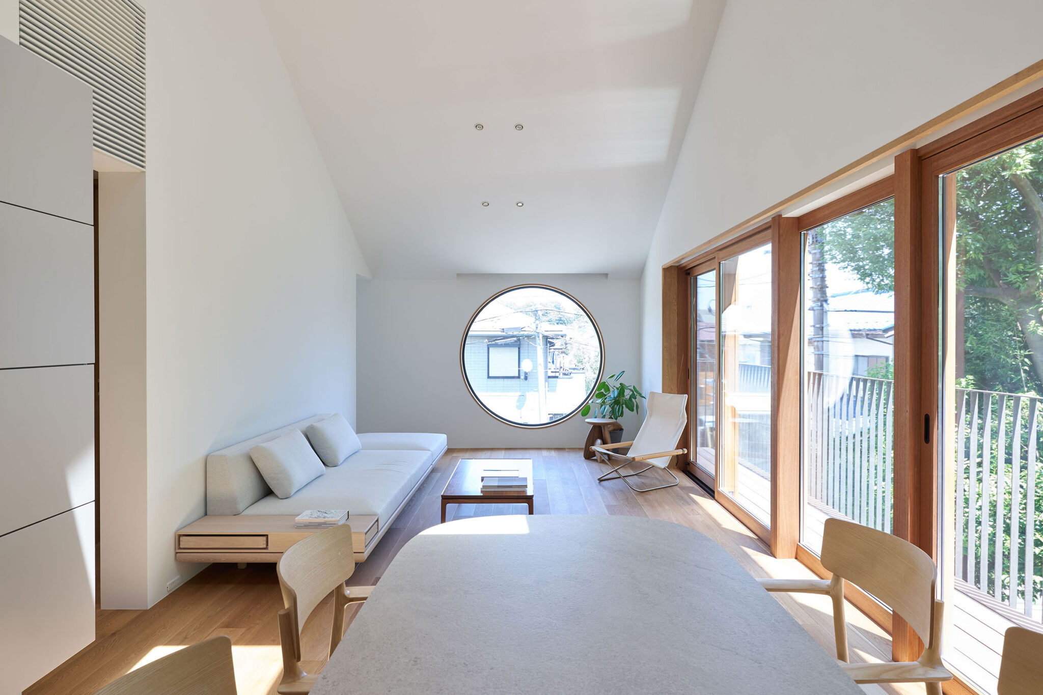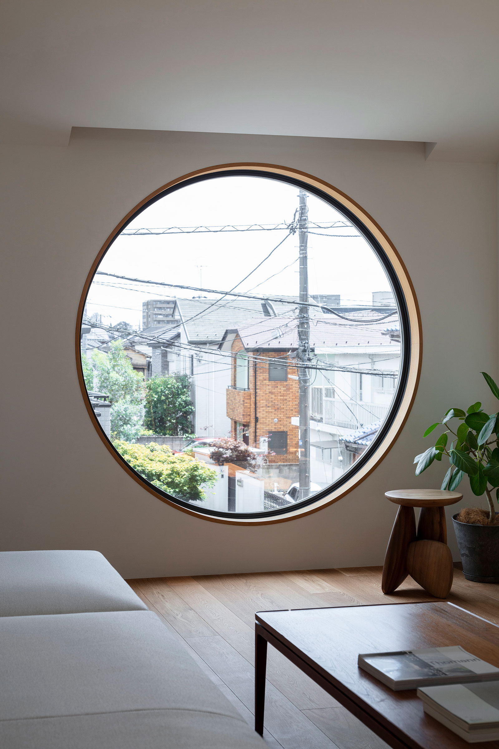 2階の住宅のリビングルームの東側には朝日を向かい入れる丸窓を設えて、時間とともに動いていく床に投影される円い自然光を楽しむことができる。南向きの少し日本の障子窓のような横長の窓は、公園の緑の風景を最大限住空間に取り入れてくれる。