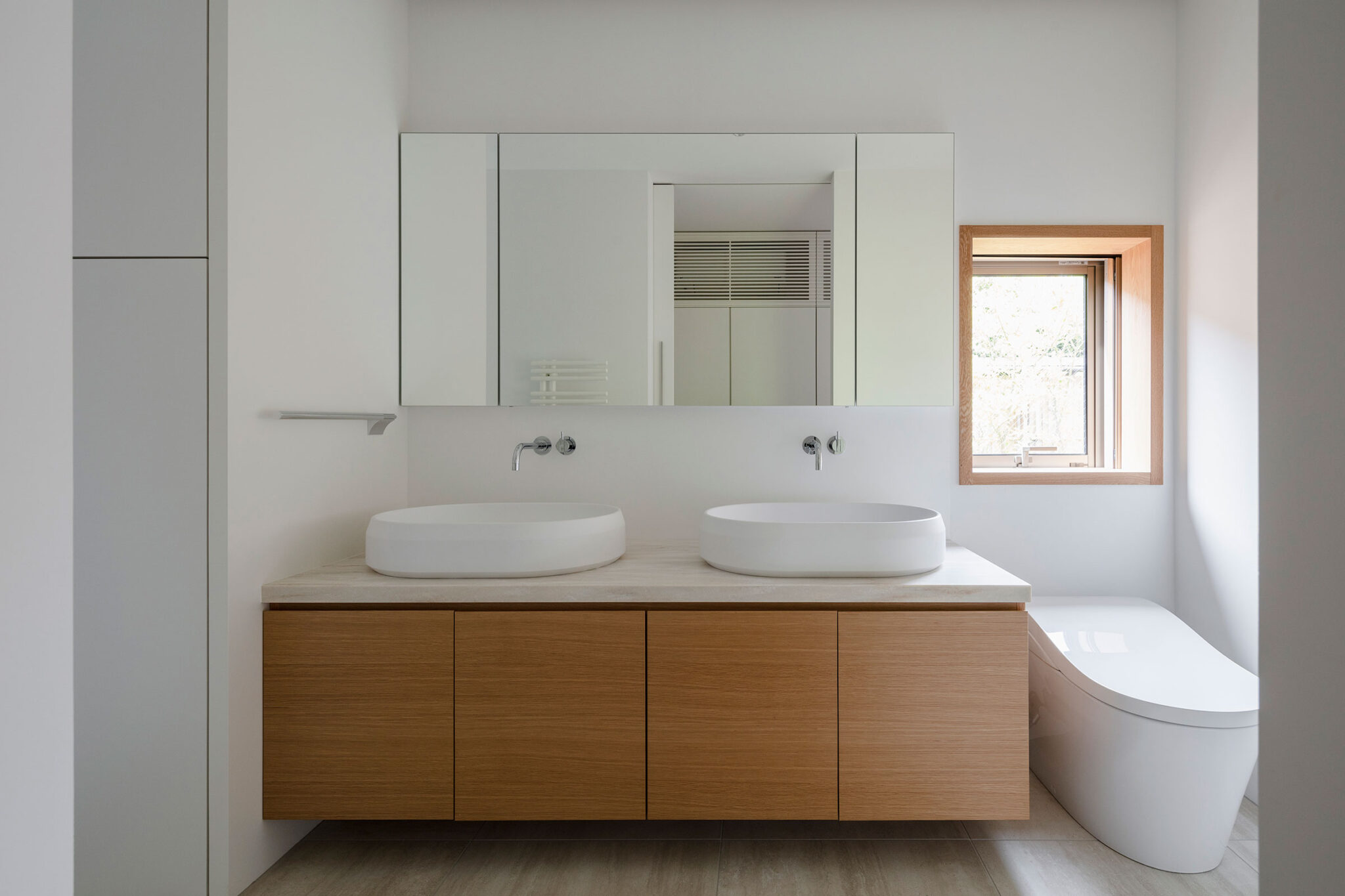 KIAS イシダアーキテクツスタジオによる、東京・杉並区の「善福寺公園の住宅」。公園に面するギャラリー併設の住まい。彫刻のように空間をつくった後に構造を形成する設計で、豊かな空間につながる“心地よいずれ”を備えた建築を構築。外部では9mのベンチで地域に“ソーシャルな場”も提供 1階、洗面所・トイレ photo©山内紀人