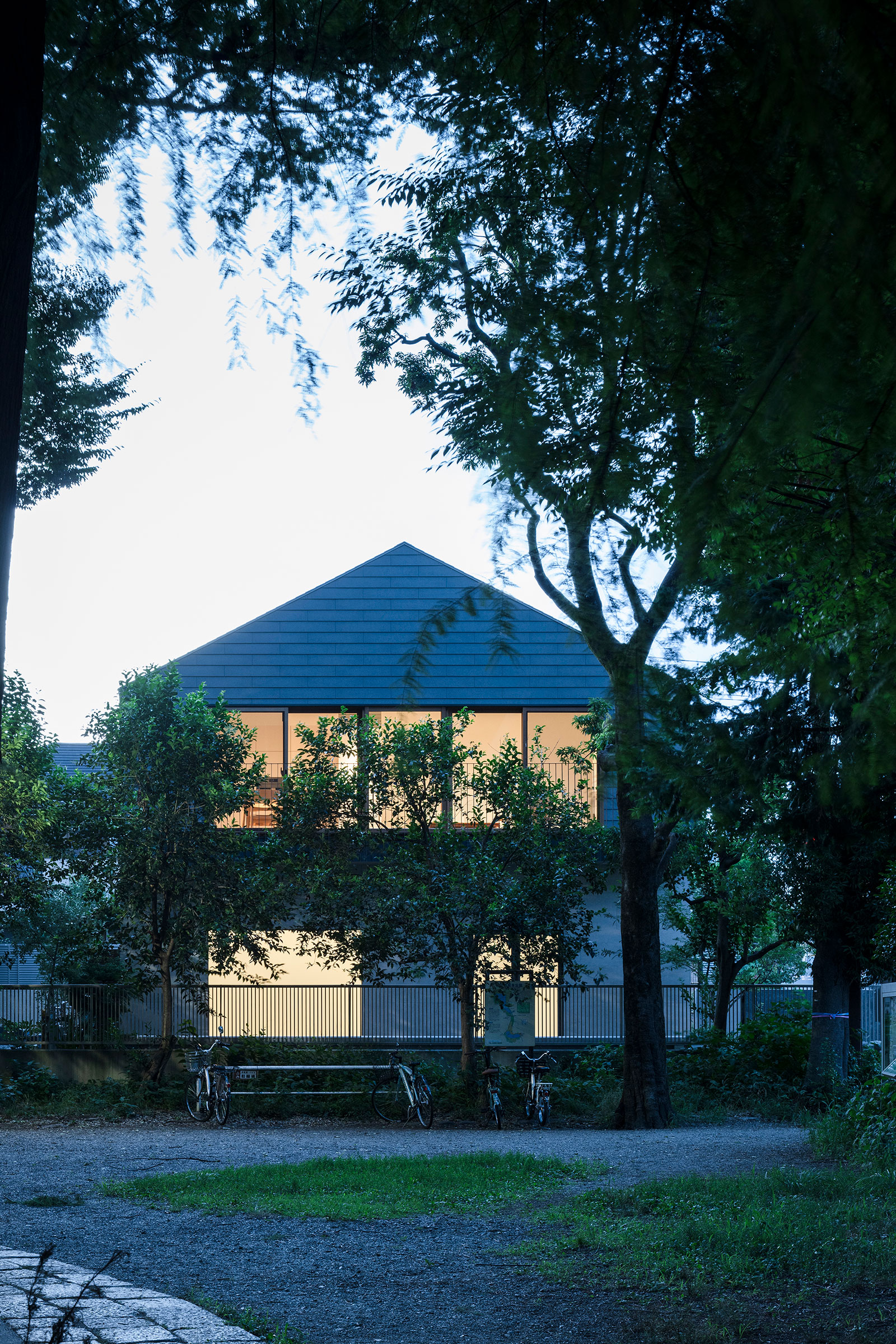 KIAS イシダアーキテクツスタジオによる、東京・杉並区の「善福寺公園の住宅」。公園に面するギャラリー併設の住まい。彫刻のように空間をつくった後に構造を形成する設計で、豊かな空間につながる“心地よいずれ”を備えた建築を構築。外部では9mのベンチで地域に“ソーシャルな場”も提供 外観、南東側の公園より見る。夕景 photo©山内紀人