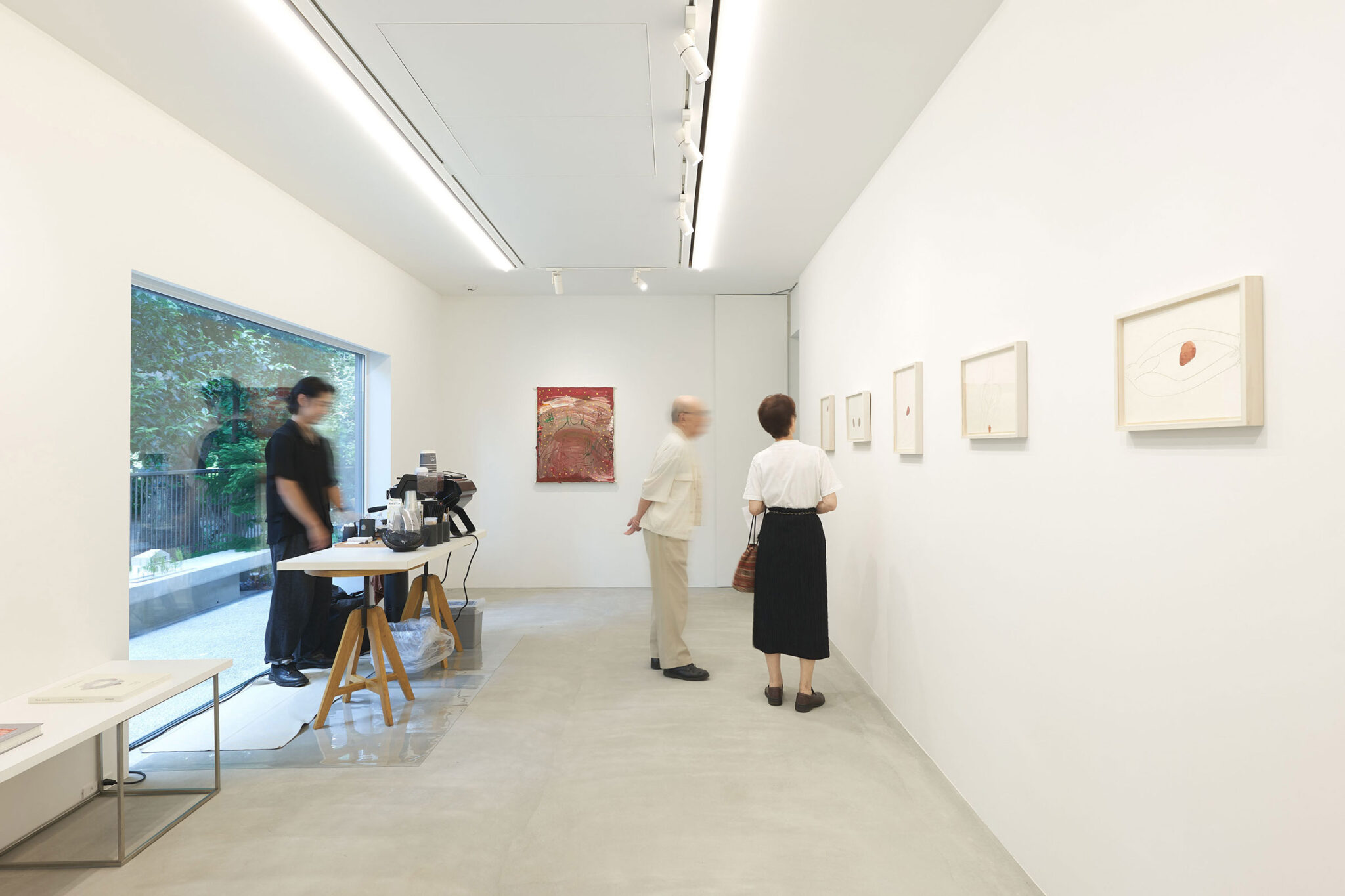 KIAS イシダアーキテクツスタジオによる、東京・杉並区の「善福寺公園の住宅」。公園に面するギャラリー併設の住まい。彫刻のように空間をつくった後に構造を形成する設計で、豊かな空間につながる“心地よいずれ”を備えた建築を構築。外部では9mのベンチで地域に“ソーシャルな場”も提供 1階、ギャラリー(展示中の様子) photo©小野奈那子
