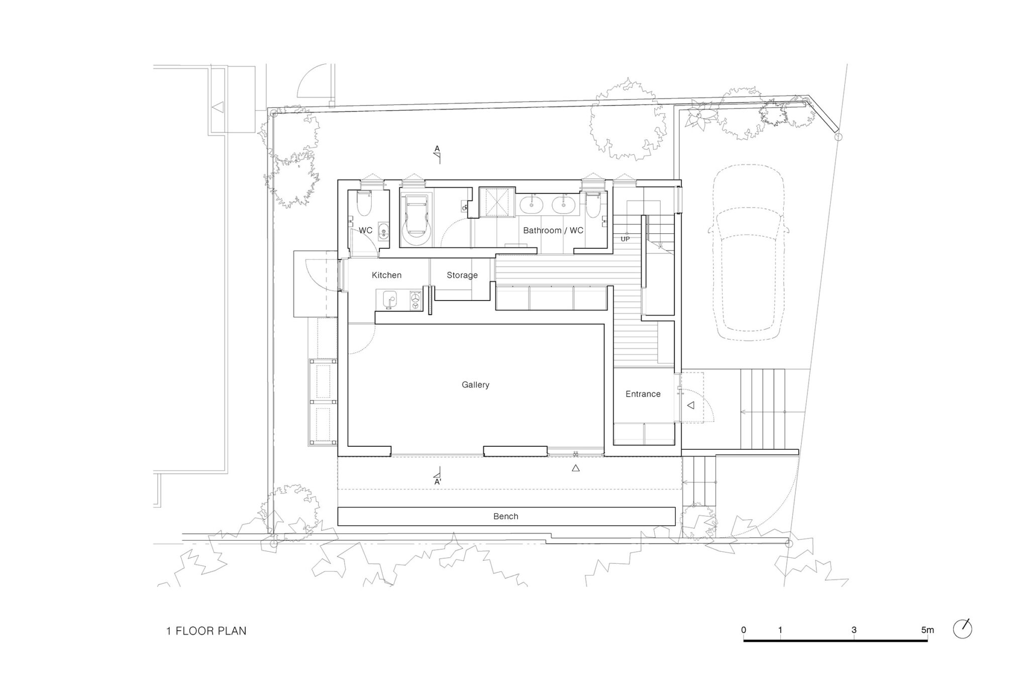 KIAS イシダアーキテクツスタジオによる、東京・杉並区の「善福寺公園の住宅」。公園に面するギャラリー併設の住まい。彫刻のように空間をつくった後に構造を形成する設計で、豊かな空間につながる“心地よいずれ”を備えた建築を構築。外部では9mのベンチで地域に“ソーシャルな場”も提供 1階平面図 image©イシダアーキテクツスタジオ