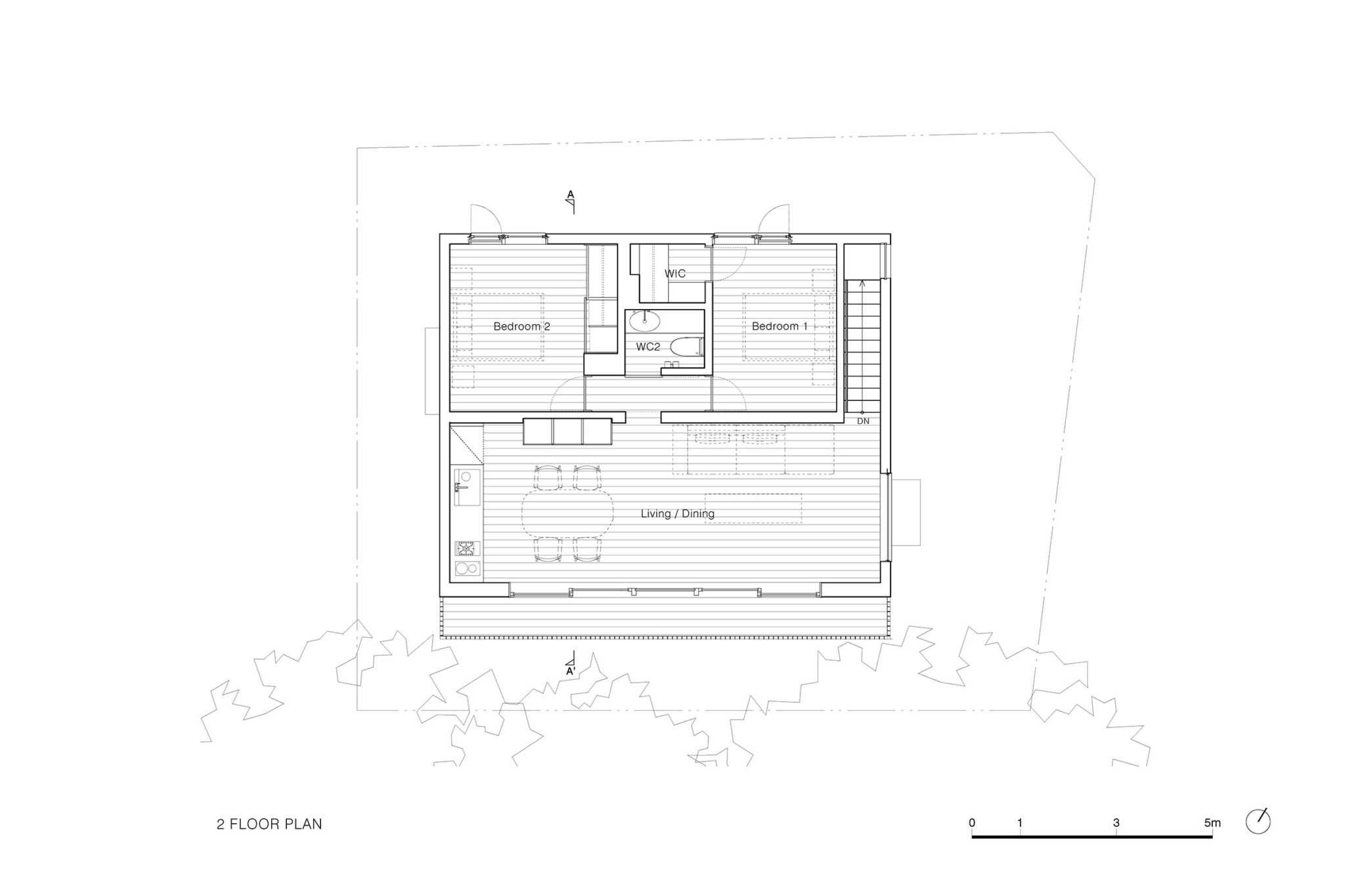 KIAS イシダアーキテクツスタジオによる、東京・杉並区の「善福寺公園の住宅」。公園に面するギャラリー併設の住まい。彫刻のように空間をつくった後に構造を形成する設計で、豊かな空間につながる“心地よいずれ”を備えた建築を構築。外部では9mのベンチで地域に“ソーシャルな場”も提供 2階平面図 image©イシダアーキテクツスタジオ
