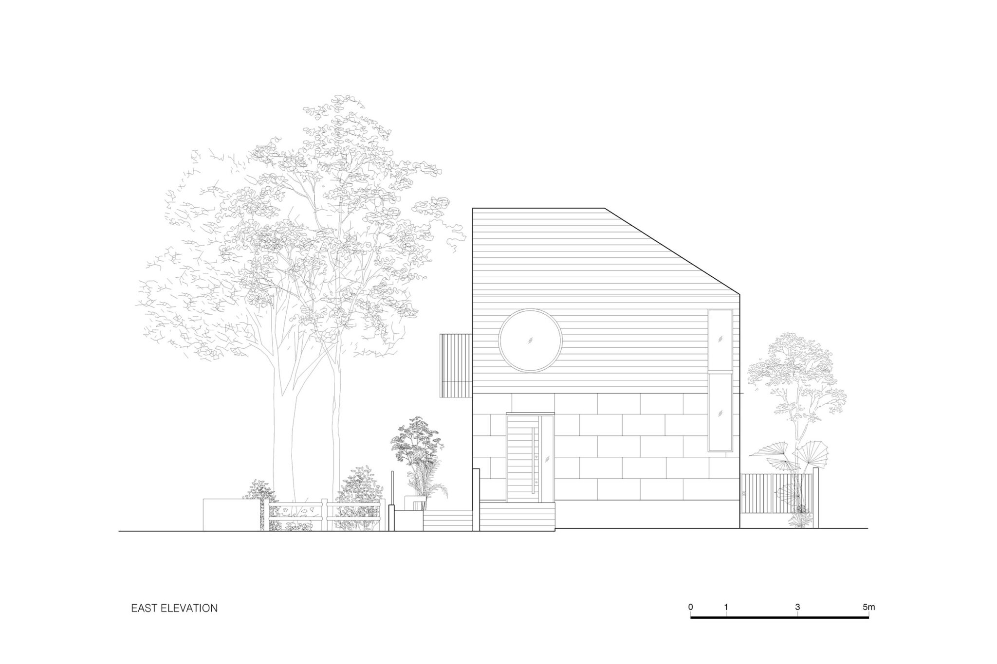 KIAS イシダアーキテクツスタジオによる、東京・杉並区の「善福寺公園の住宅」。公園に面するギャラリー併設の住まい。彫刻のように空間をつくった後に構造を形成する設計で、豊かな空間につながる“心地よいずれ”を備えた建築を構築。外部では9mのベンチで地域に“ソーシャルな場”も提供 東側立面図 image©イシダアーキテクツスタジオ