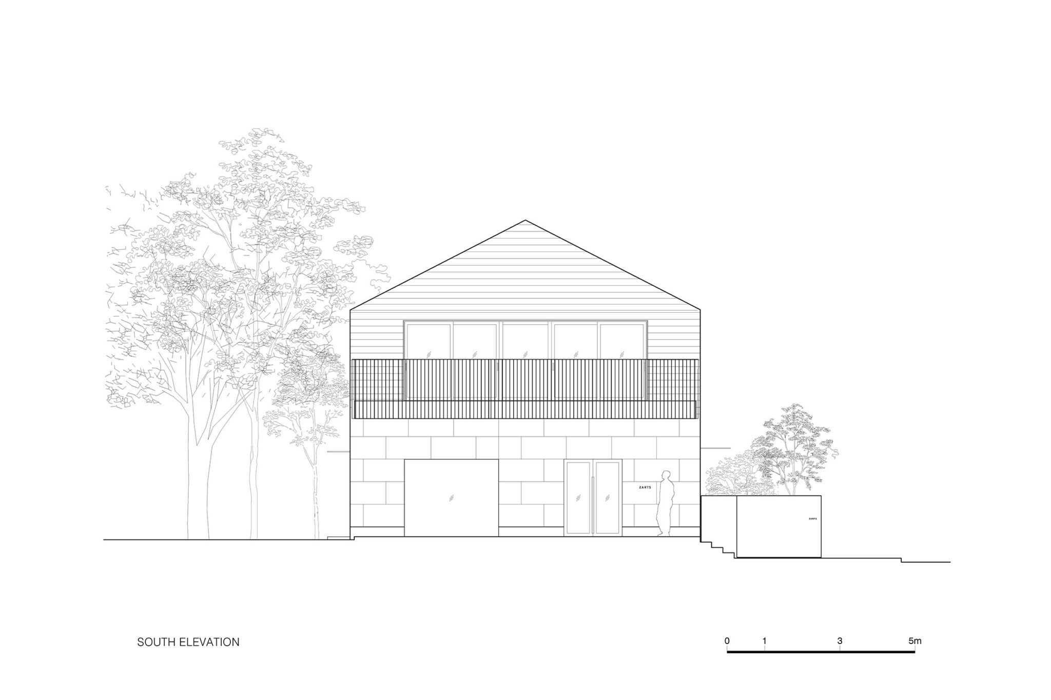 KIAS イシダアーキテクツスタジオによる、東京・杉並区の「善福寺公園の住宅」。公園に面するギャラリー併設の住まい。彫刻のように空間をつくった後に構造を形成する設計で、豊かな空間につながる“心地よいずれ”を備えた建築を構築。外部では9mのベンチで地域に“ソーシャルな場”も提供 南側立面図 image©イシダアーキテクツスタジオ