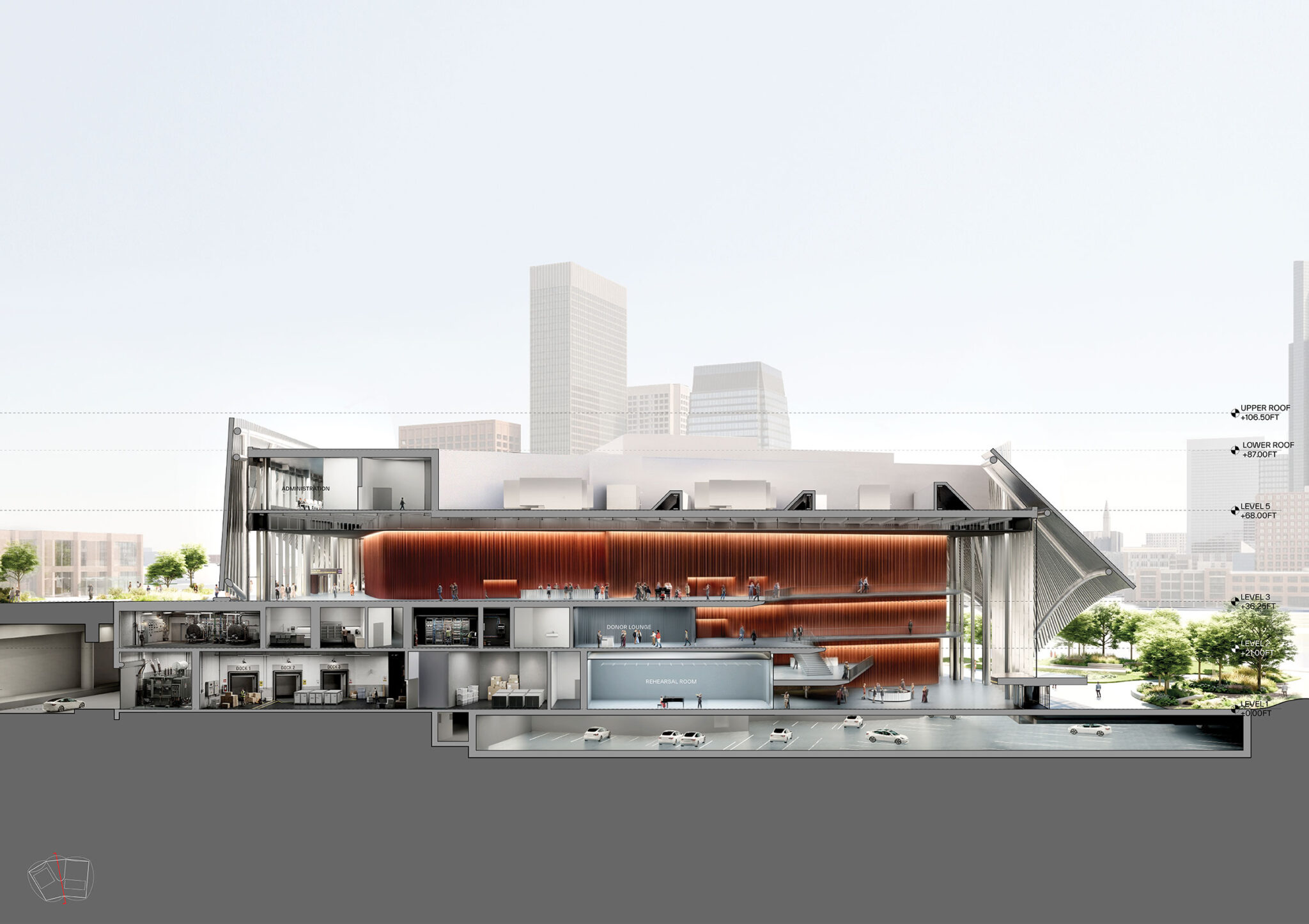 A transparent rehearsal space offers visitors a glimpse behind the scenes, while a sensory room offers a calming environment during performances. Crowning the building, a roof terrace features sweeping views of Broadway, the Cumberland River, and the Nashville skyline.
