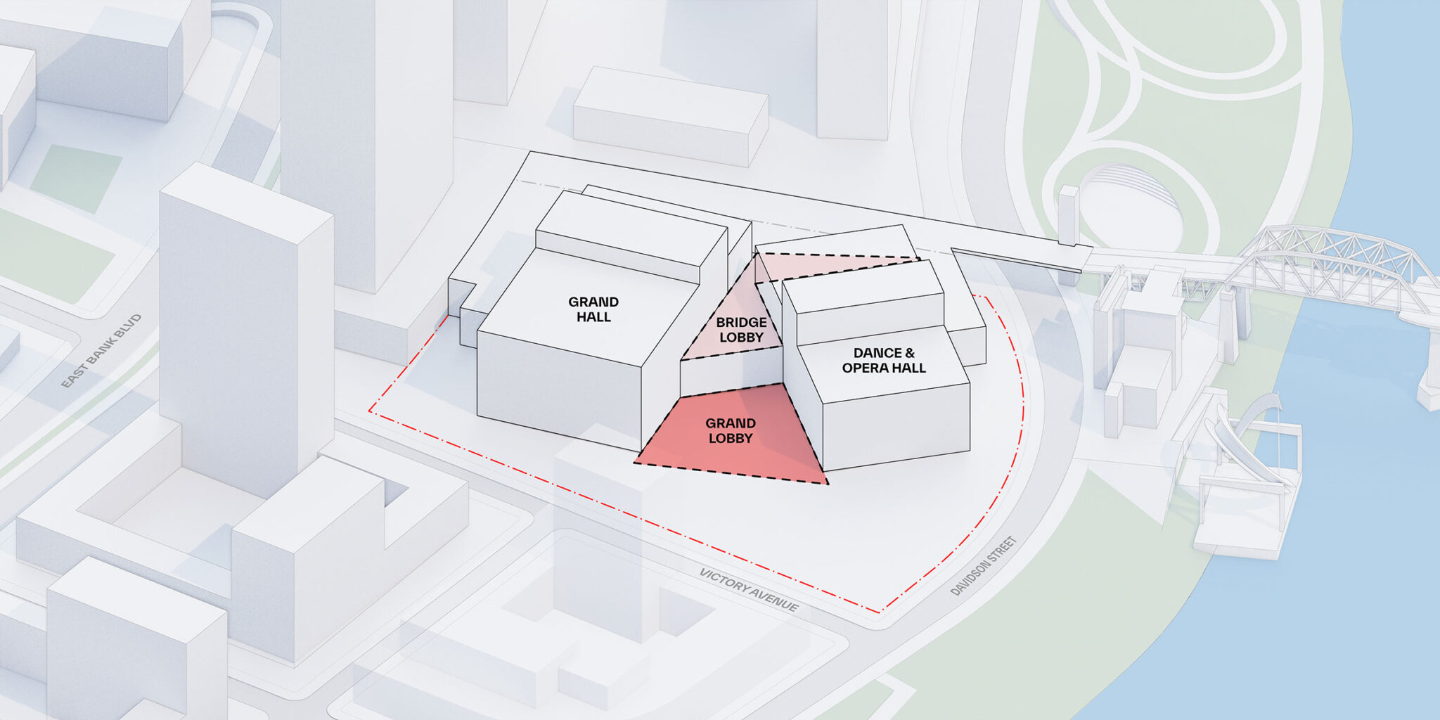 “While typical performing arts centers have a clearly defined front and back, the site conditions of TPAC offer a unique opportunity to hide the back-of-house under the bridge, allowing the public space to surround the building on all sides. The dual entrances and wrap-around lobbies activate the entire perimeter – from ground level to bridge level – connecting audiences to the venue’s surroundings.