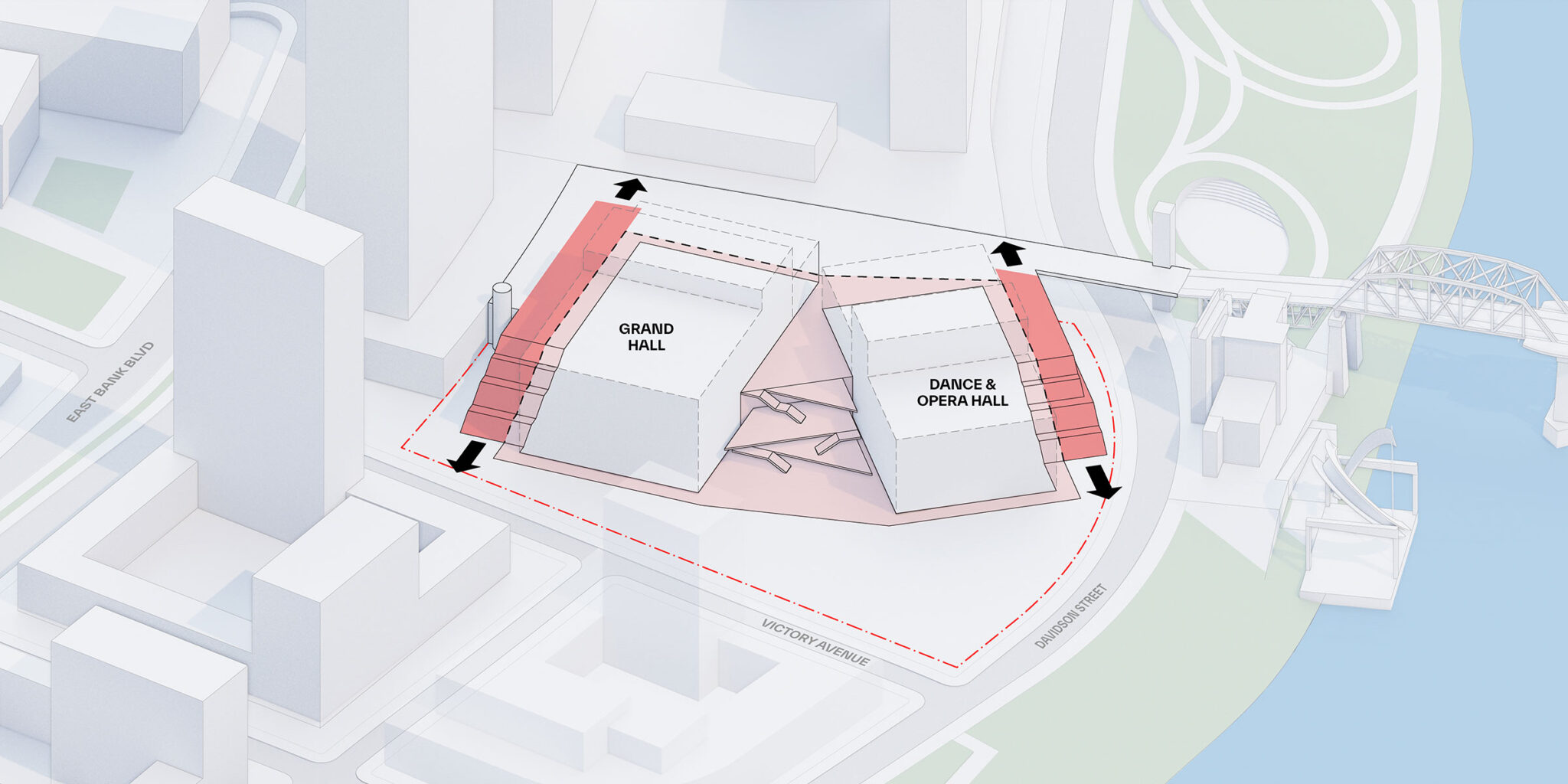 カンバーランド・パークおよびテネシー・タイタンズのニッサン・スタジアムに隣接するウォーターフロントの敷地に位置する新しいTPACは、4つの公演空間――多機能のグランド・ブロードウェイ劇場、ダンスとオペラのホール、柔軟に利用可能なブラックボックス・シアター、そして親密なキャバレー空間――に加え、リハーサルスタジオや教室も備えています。TPACが現在のダウンタウンの所在地から移行するに伴い、この307,000平方フィート(約28,500平方メートル)の施設は、ナッシュビル・バレエ、ナッシュビル・オペラ、ナッシュビル・レパートリー・シアターの新たな本拠地となるとともに、巡回ブロードウェイ公演やダンス公演、地域イベントのための会場を創出します。