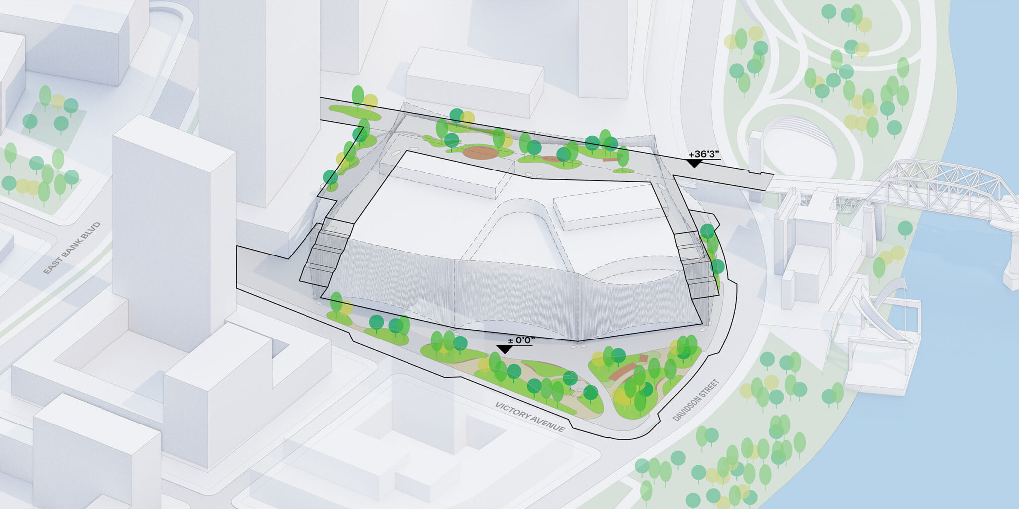屋外階段がTPACを川へとつなぎ、このセンターをナッシュビルの新しいイーストバンク地区に統合するとともに、その先の都市との接続性を高めています。OLINによるランドスケープデザインは、多様な植栽とともに、屋外の公共パフォーマンスのための小規模なスペースや、集いの場、遊びのための木立で建物の周囲を取り囲んでいます。