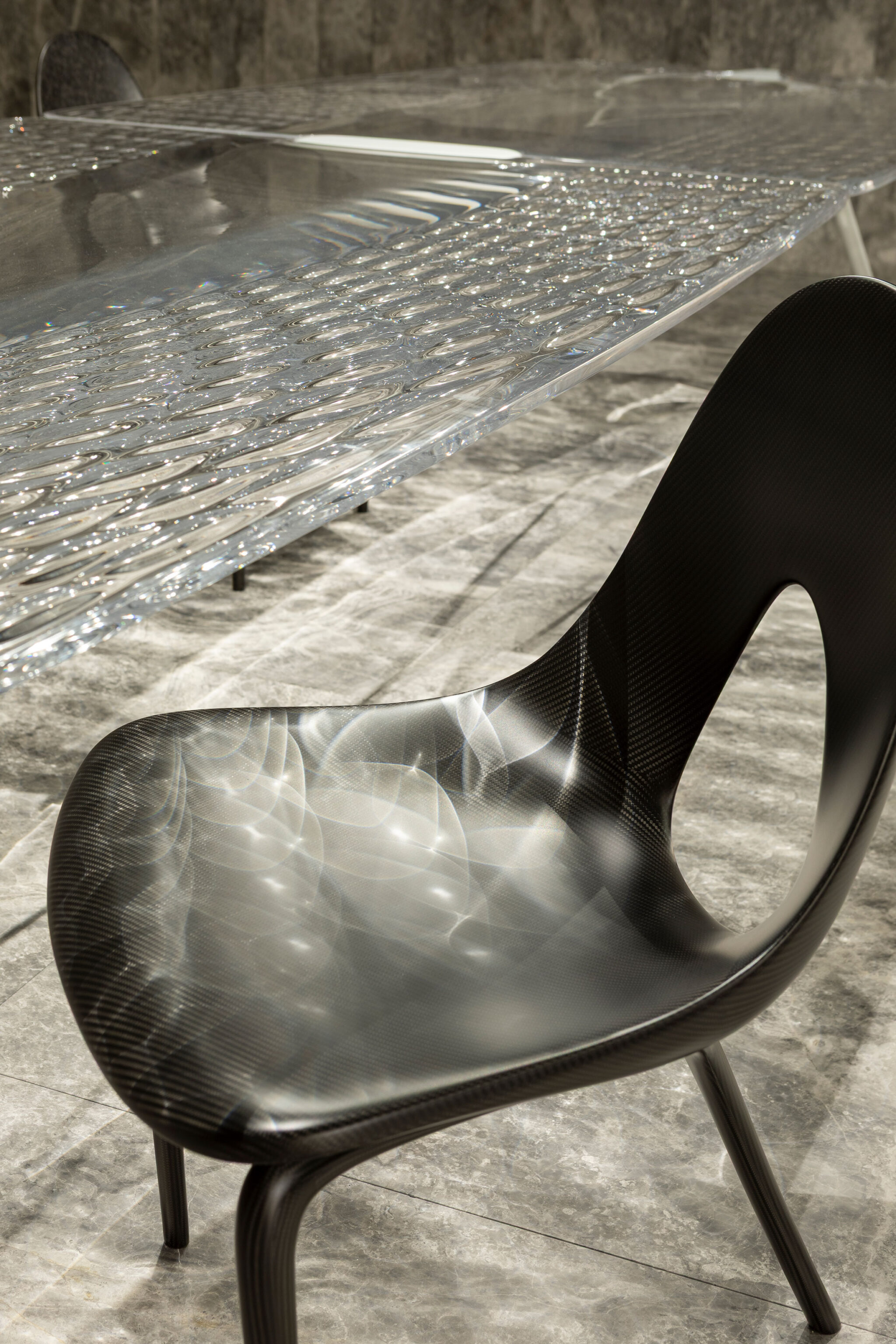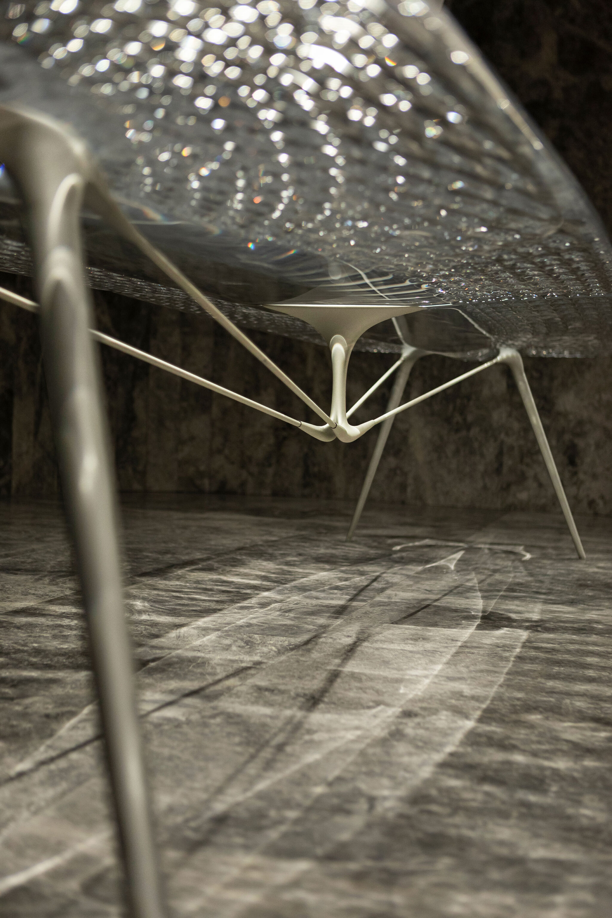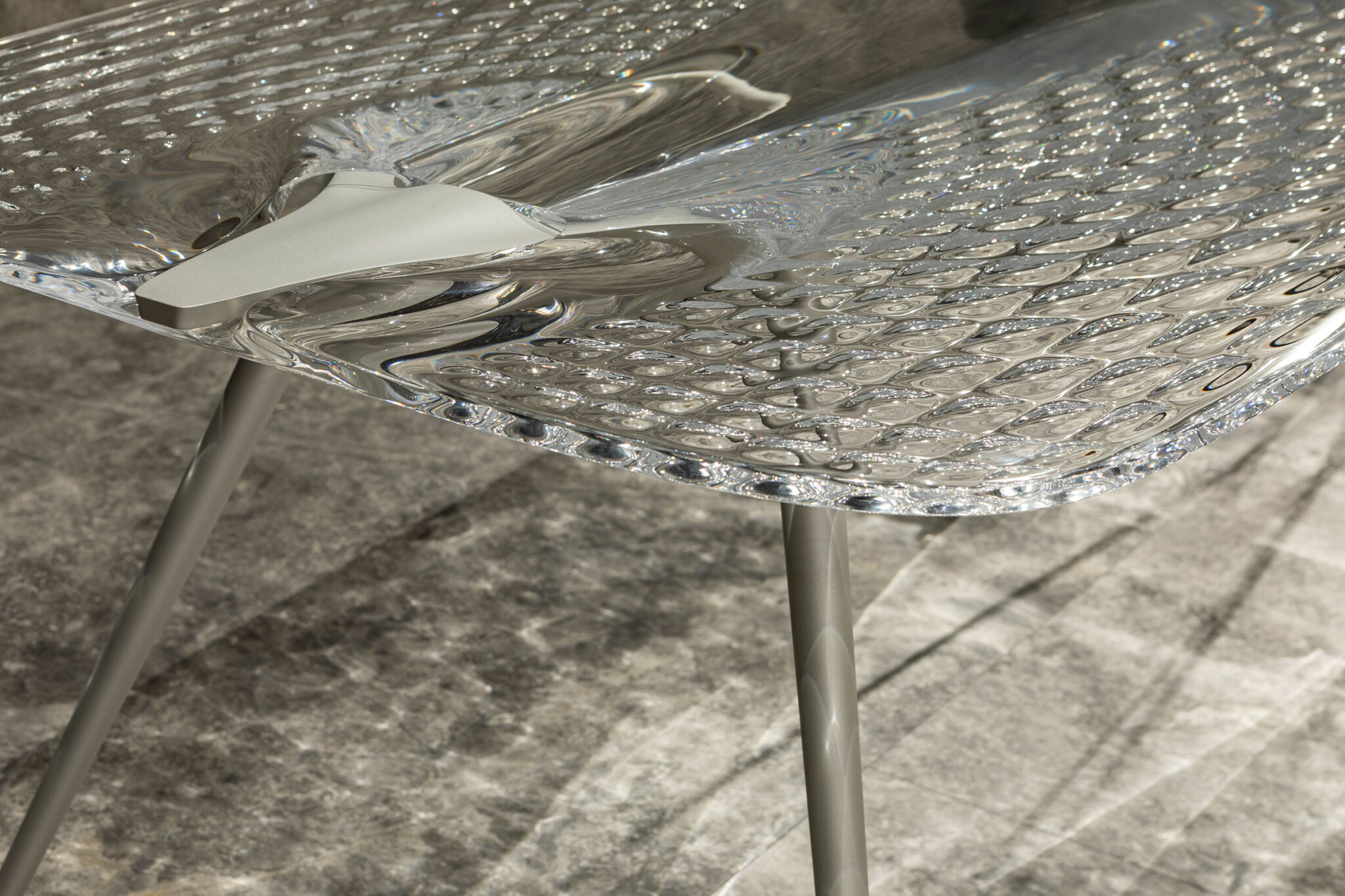 テーブルの下面は格子状の幾何学へとくり抜かれており、それは流れのように波打ち、その縁は信じがたいほどの薄さへと先細りしながら、その開口部は地平線のように開いています。本コレクションは、固体性と浮遊のあいだ、そして大地と空気のあいだにある張りつめた空間に存在します。
