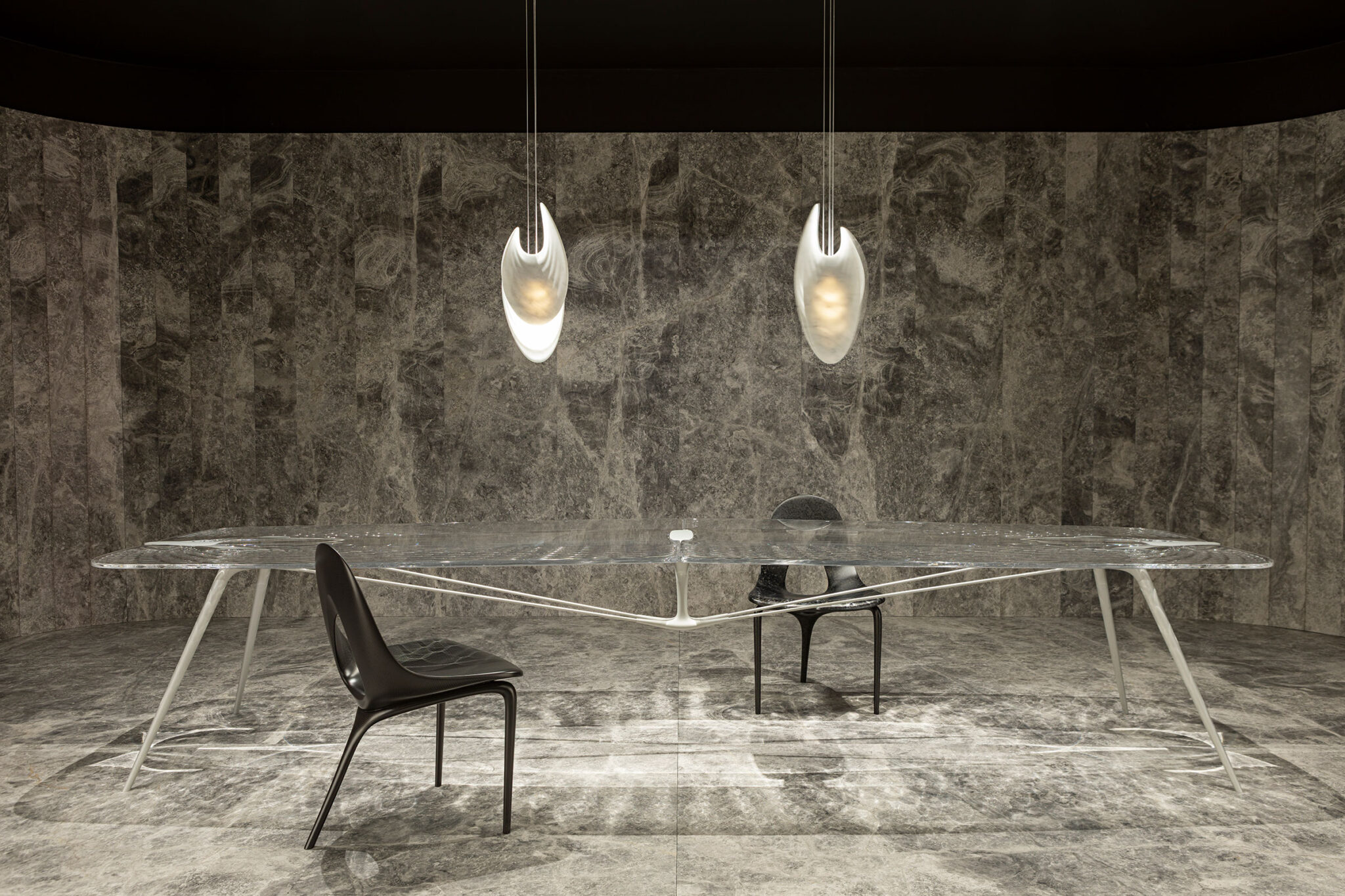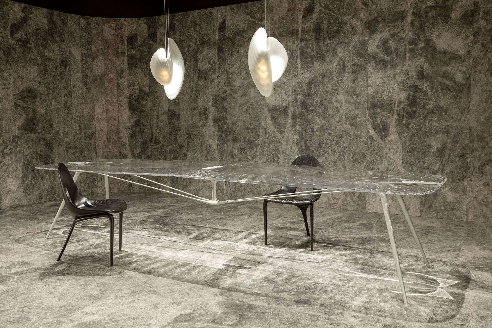 家具ブランドCitcoの為にデザインされました。建築家は、静的で重い素材への“先入観”に挑み、流動的で軽やかな存在への“変容”を志向しました。そして、テーブルの構造は“荷重分散・バランス・張力”の原理を通じて構想され“橋”の様に機能します。