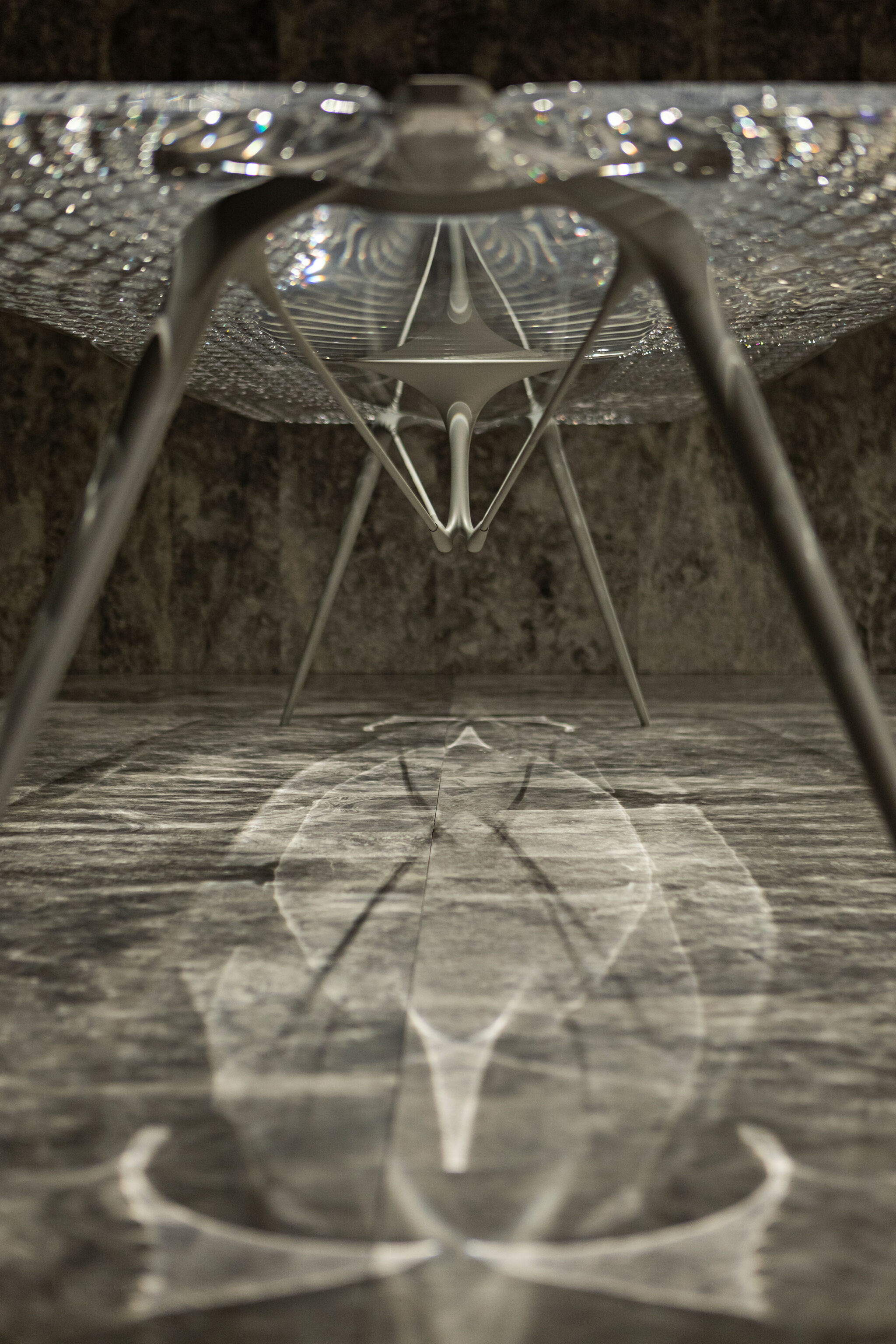 The table’s underside is hollowed into latticed geometries that ripple like currents with edges that taper into improbable thinness while its apertures open like horizons. The collection exists in the charged space between solidity and suspension, between earth and air.