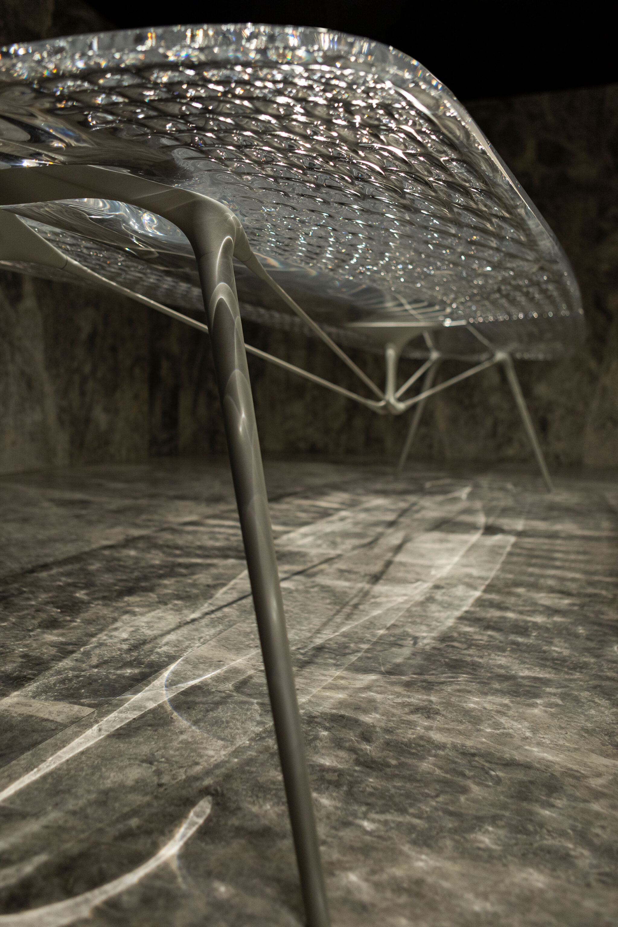 SHARE ザハ・ハディド・アーキテクツによる「エアリス・コレクション」。家具ブランドCitcoの為にデザイン。静的で重い素材への“先入観”に挑み、流動的で軽やかな存在への“変容”を志向。テーブルの構造は“荷重分散・バランス・張力”の原理を通じて構想され“橋”の様に機能