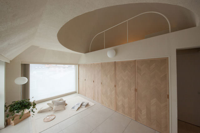 コアの両側の2枚の引戸は、用途により環状空間を適切に区切る。表面に極細のスリットを穿つことで、西日や諸室からのさまざまな光と影を透過させ、閉じながらも空間に奥行きと連続性を与えている。